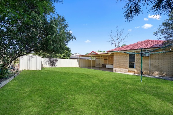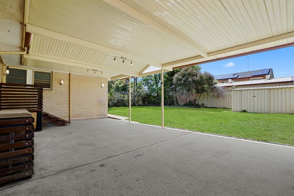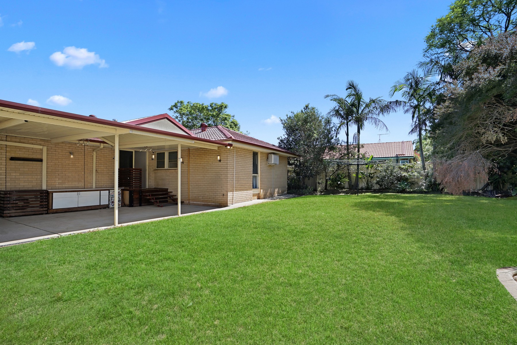 - Undercover entertainment area with fixed cabinetry, overlooking grassed yard with garden shed