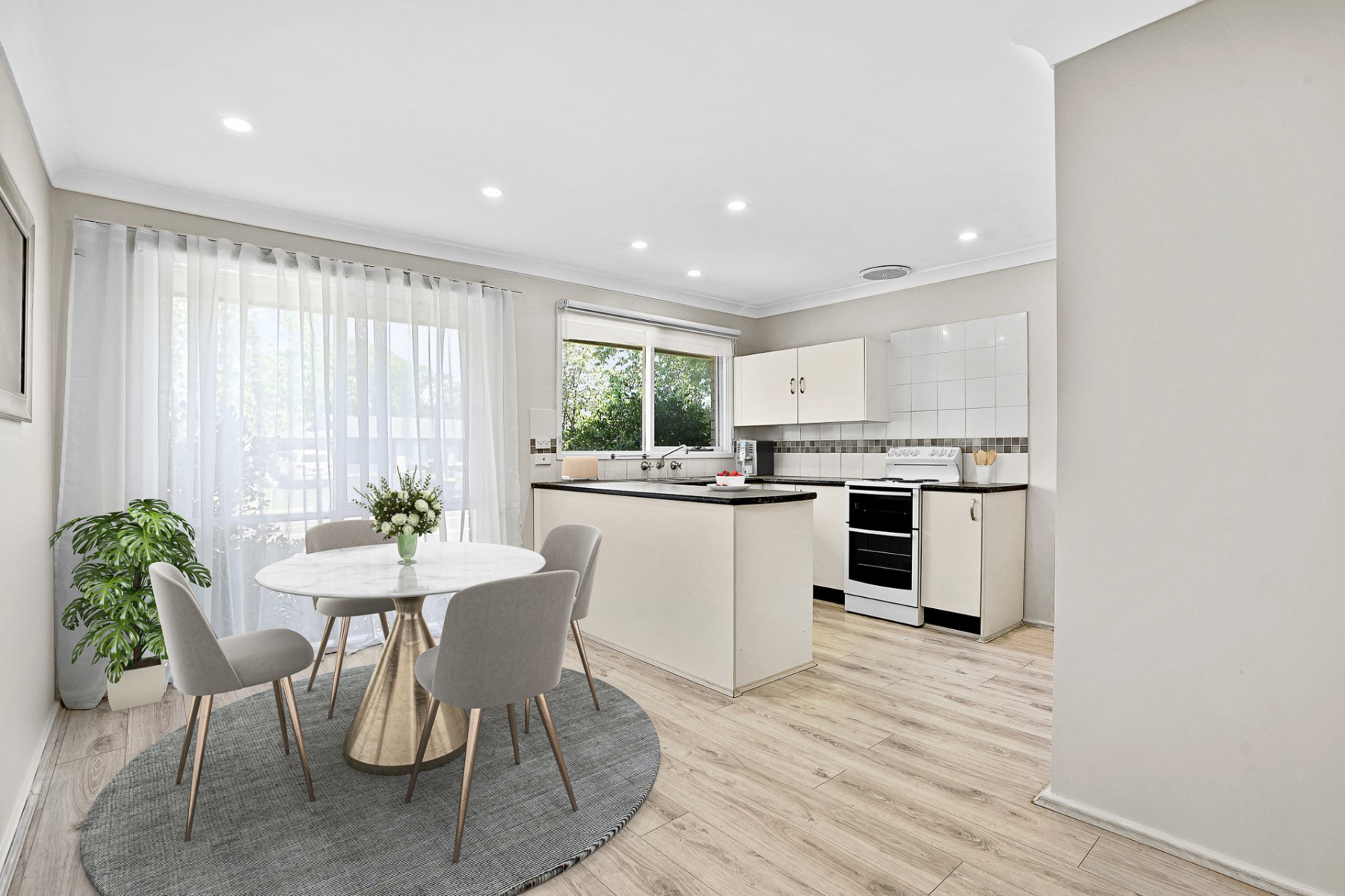 - Dining off kitchen with floating floorboards throughout