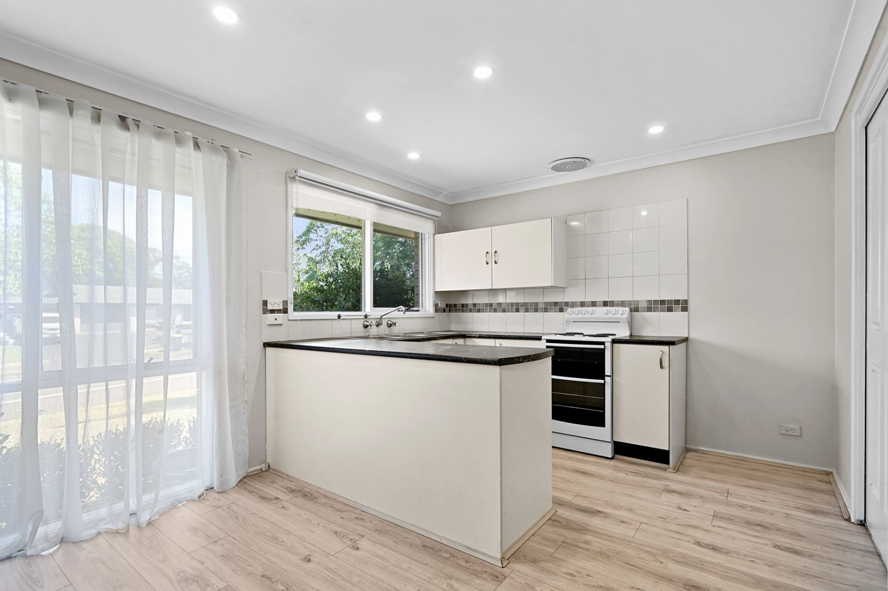 - Well appointed kitchen with freestanding westinghouse electric cooktop, oven and grill, double sink and ample cupboard space with breakfast bar