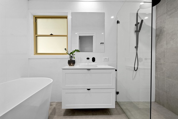 - Quality renovated bathroom with freestanding bath tub, large shower with frameless screen, black fixtures, floor to ceiling tiles with seperate toilet