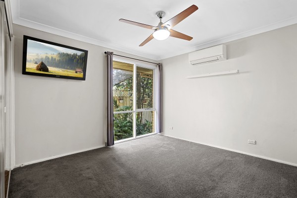 - Main bedroom with frameless built-in mirrored wardrobe, ceiling fan and mitsubishi split system air-conditioner.