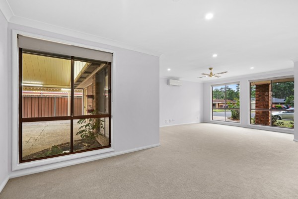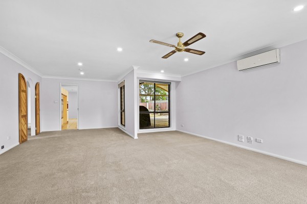 - Spacious living room to front of property with LED downlights, Fujitsu split system air-conditioner and a ceiling fan
