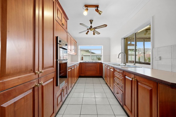 - Large timber kitchen offering belling gas oven with grill, four burner gas cook top with bay window, ASKO dishwasher, ceiling fan and ample cupboard and bench space