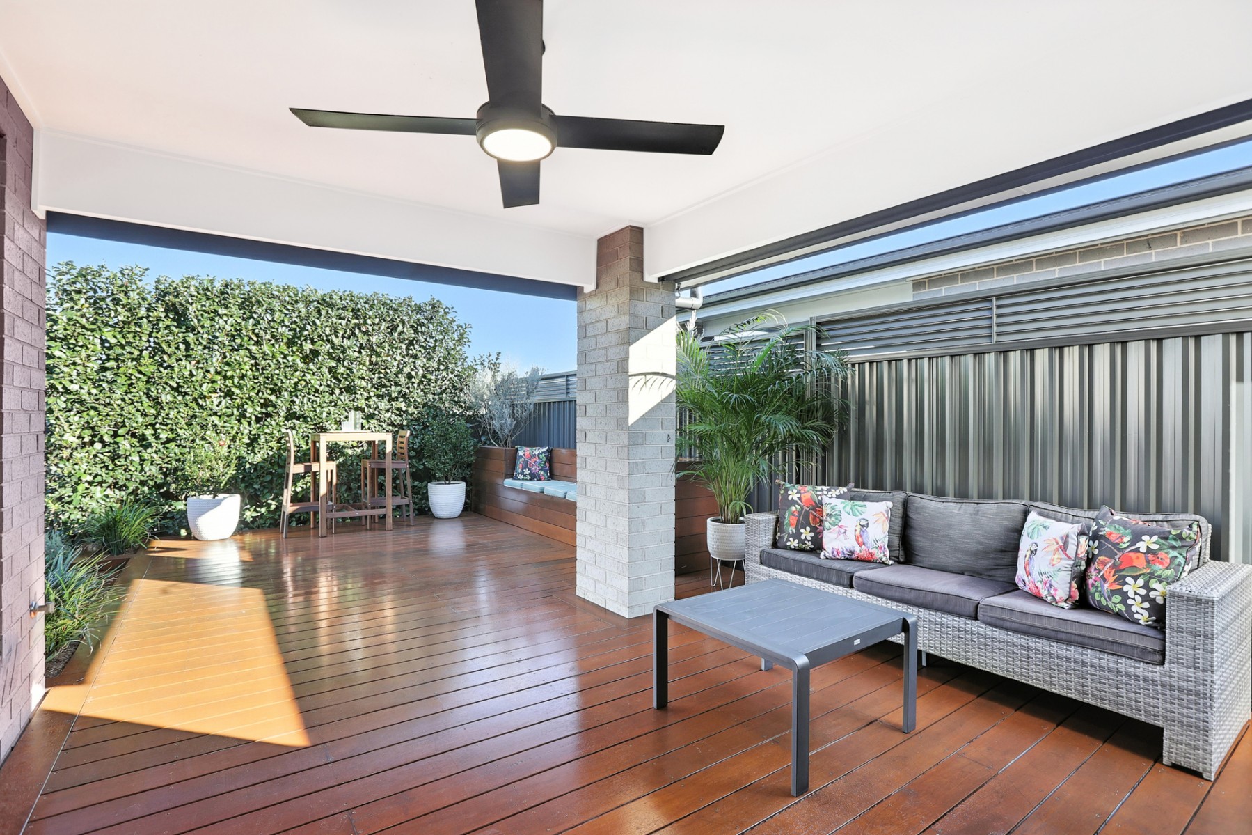 ~ Covered entertainers' deck with weatherproof blinds for year-round outdoor living