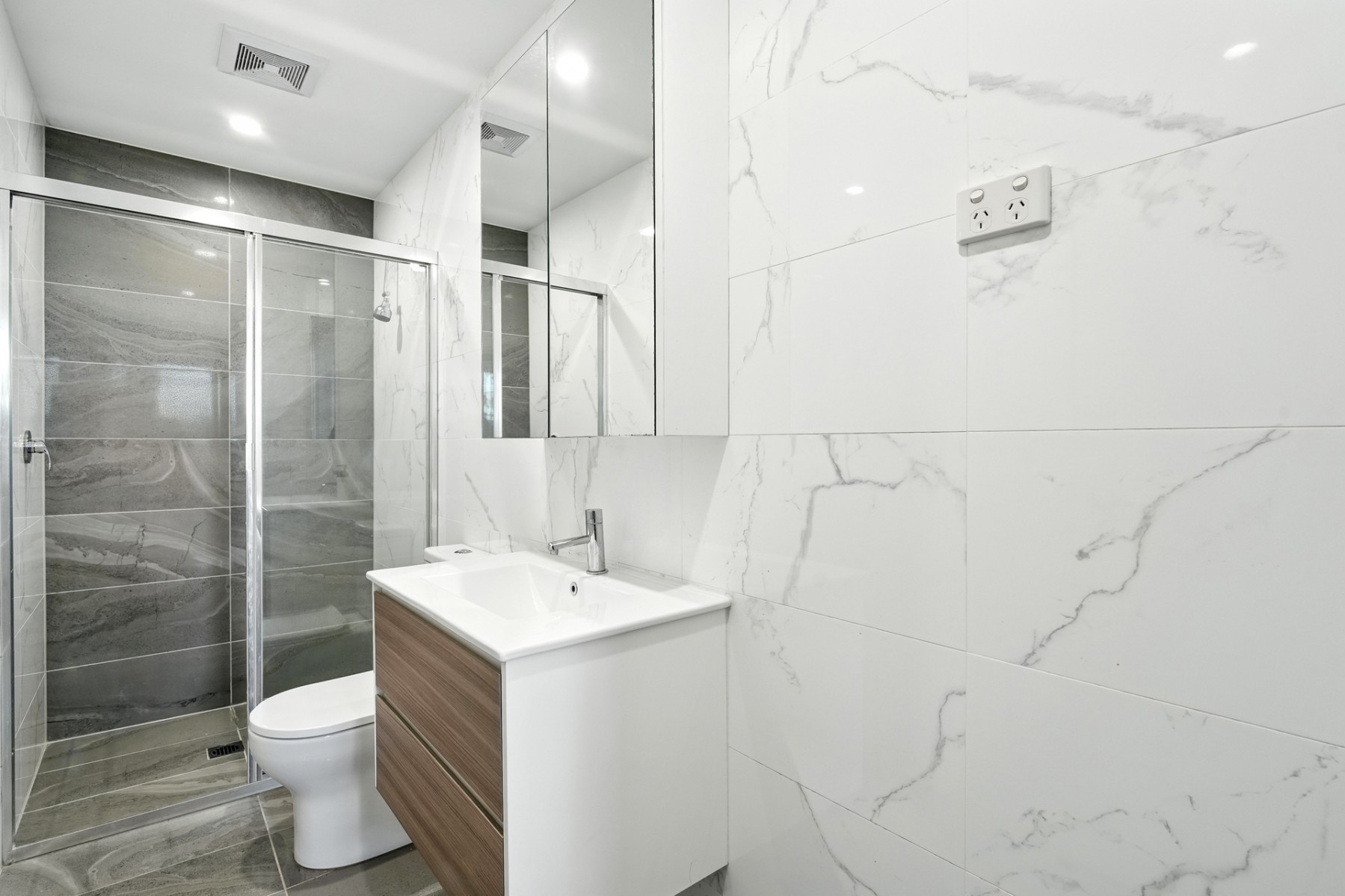 ~ Master bedroom with private en-suite featuring floor-to-ceiling tiling and floating vanity