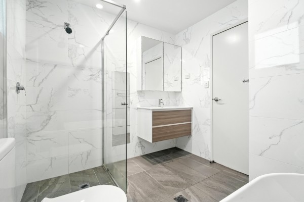 ~ Main bathroom with bathtub, frameless shower screen, and contemporary design