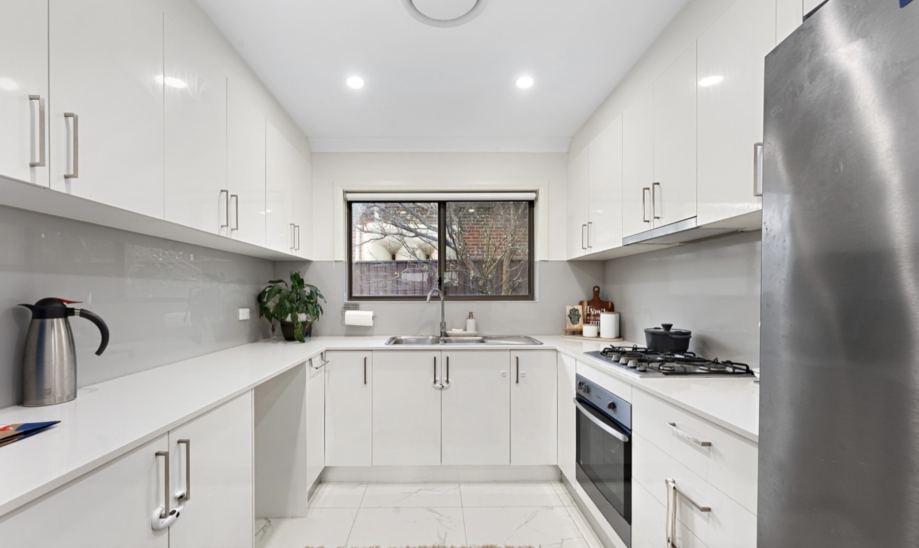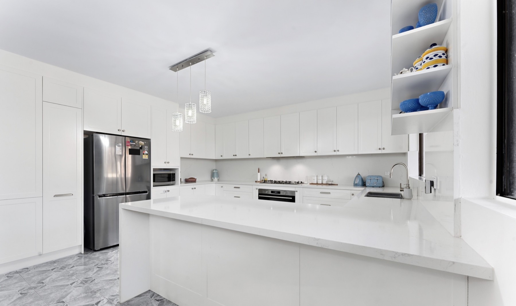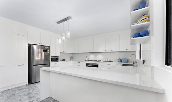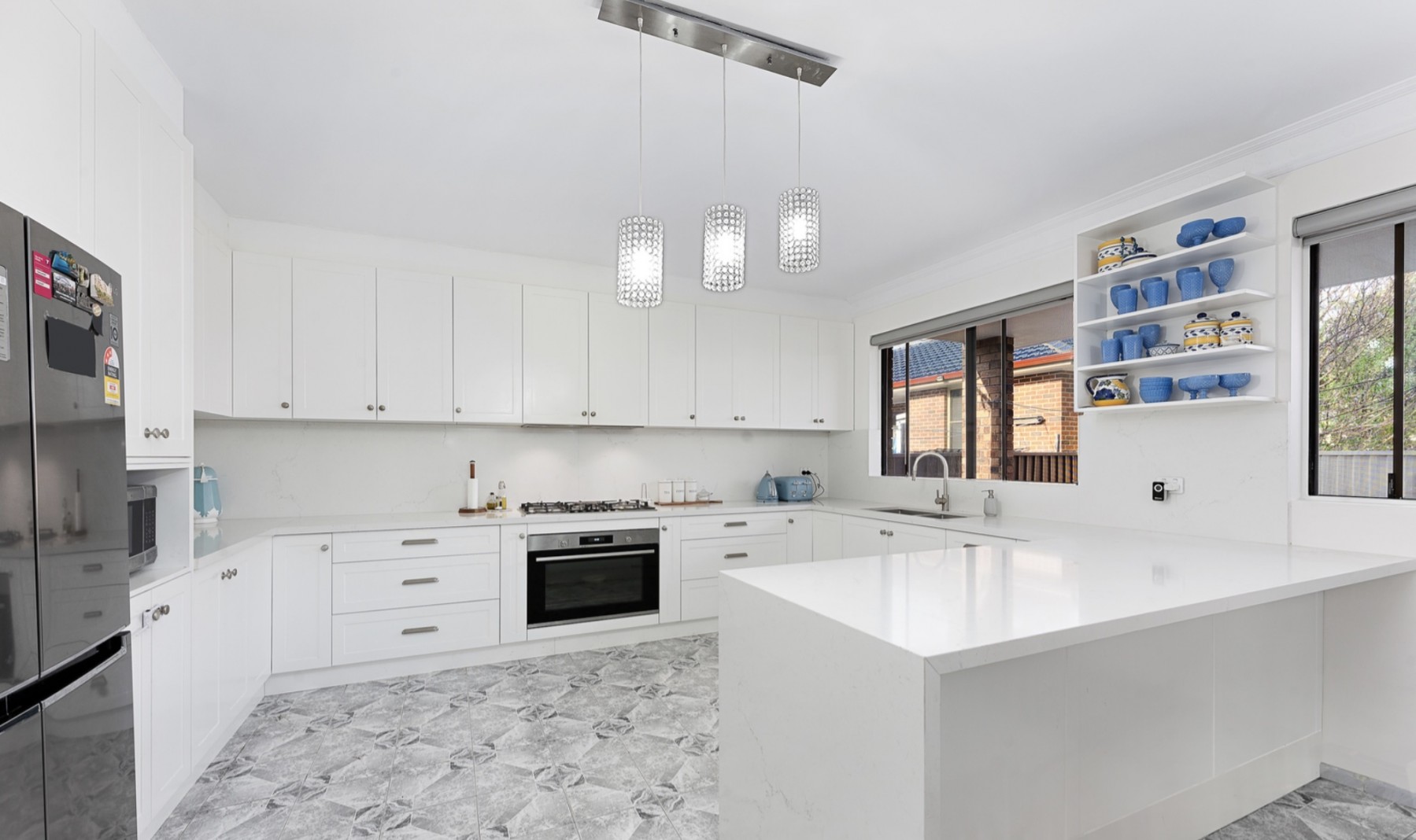 * Modern kitchen, gas cooking, stone benchtop, stainless-steel appliances