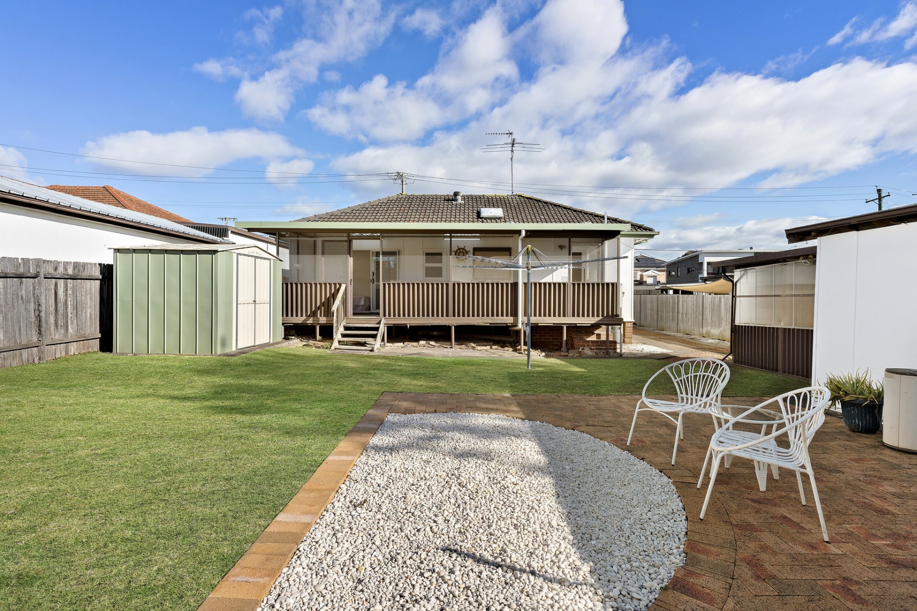 - Large backyard with garden shed and fire pit area