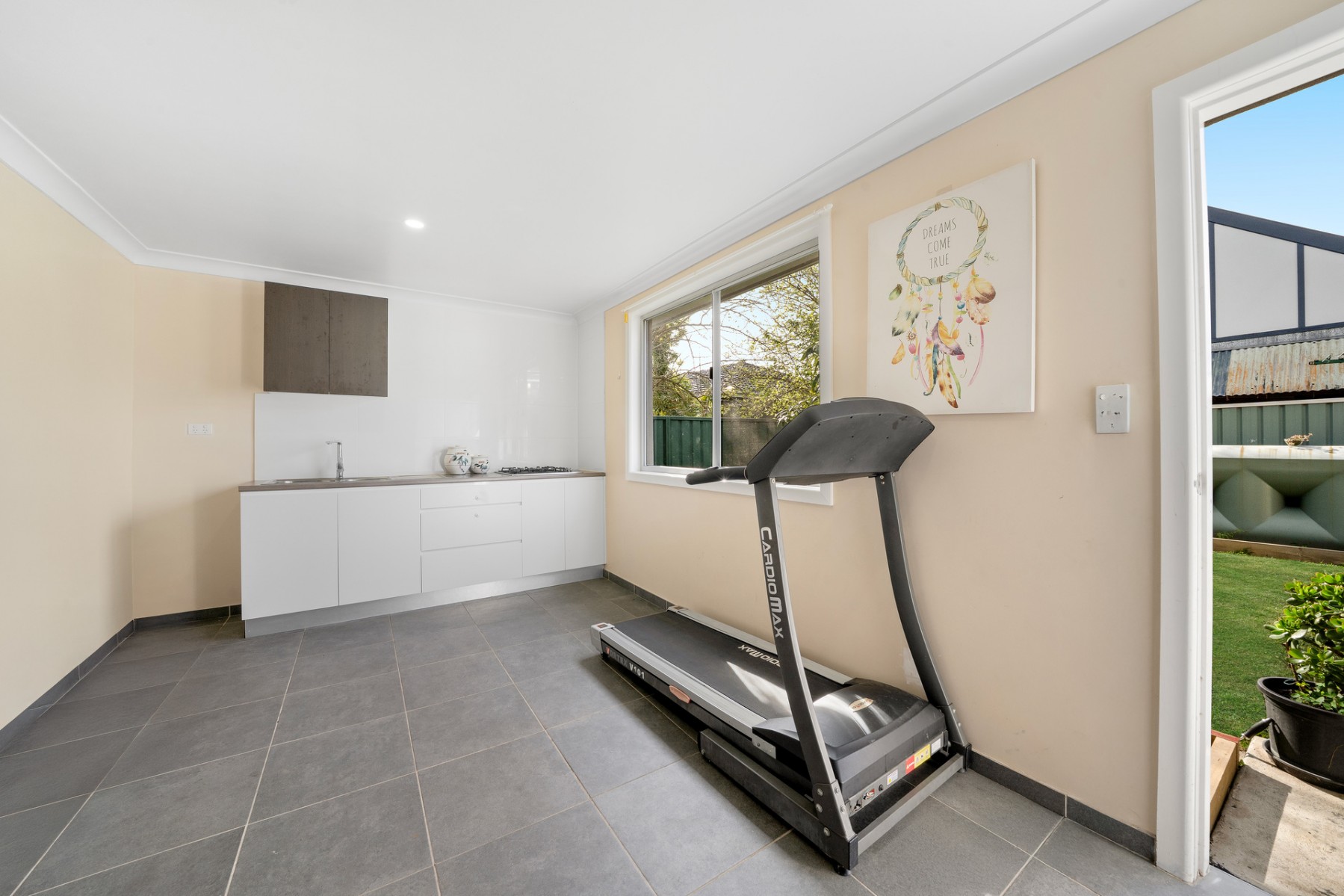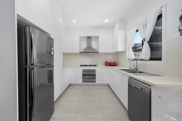- Gourmet kitchen with 40 mm stone benchtops, 900 mm gas cooktop, range hood, and dishwasher, dual basin sink with ample cupboard space.