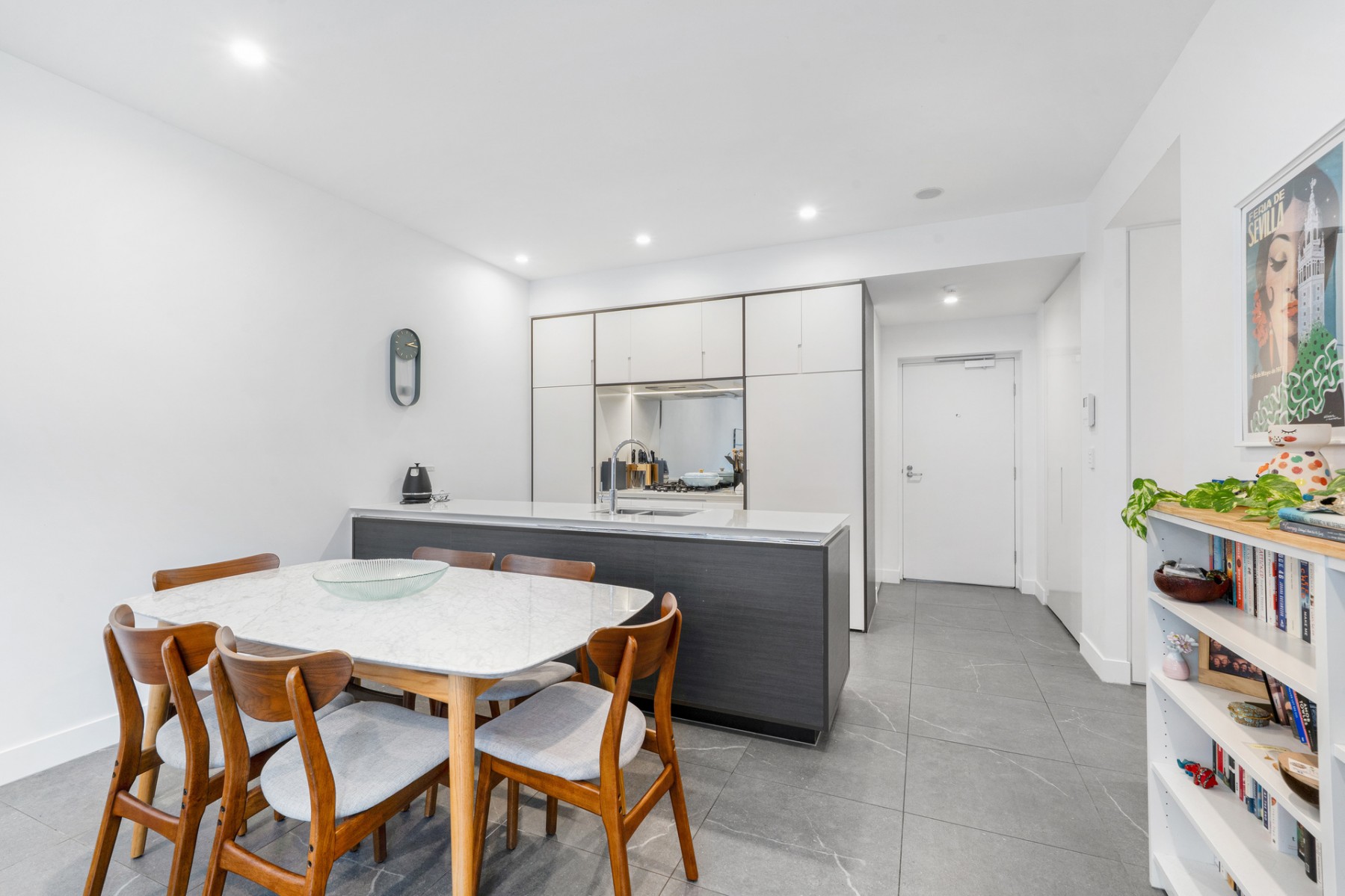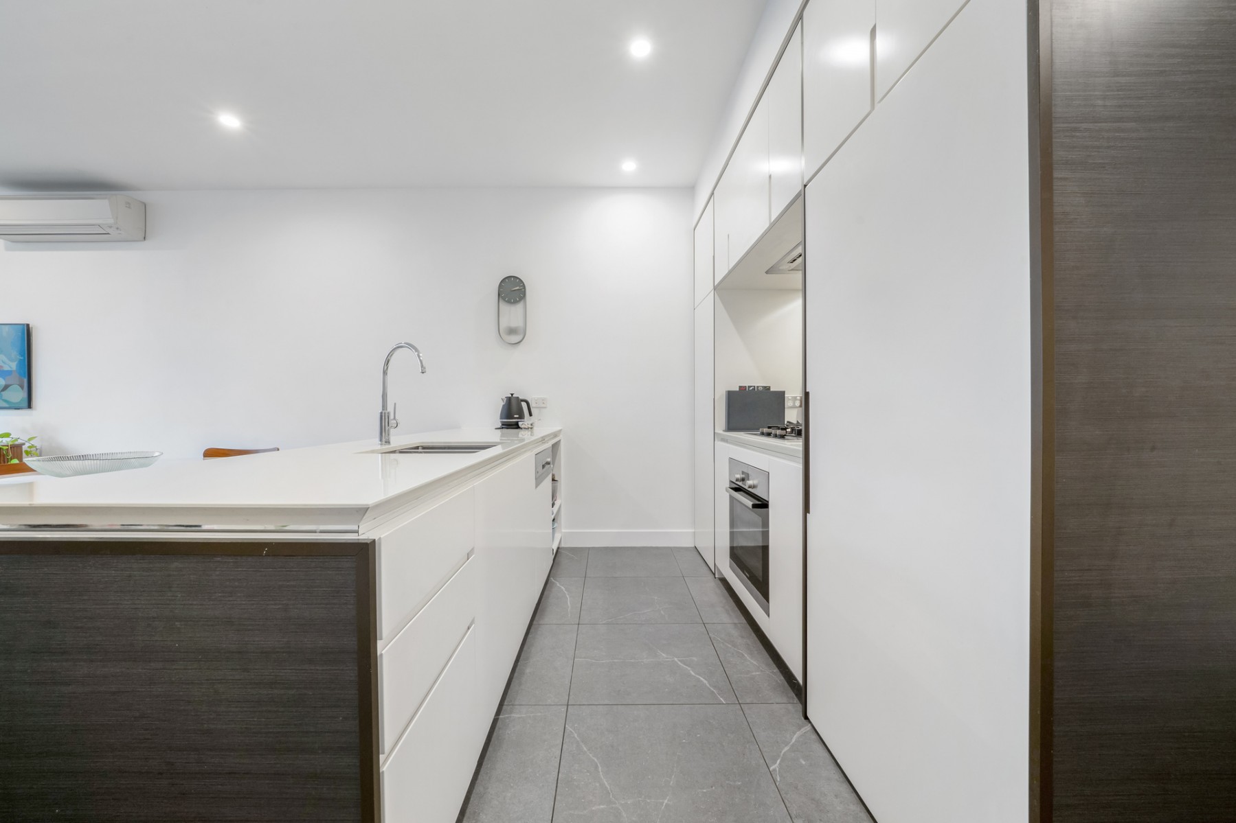 - Ultra-modern kitchen that boasts stone benchtops, mirrored splash backs, gas cooking appliances, dual basin sink & integrated dishwasher