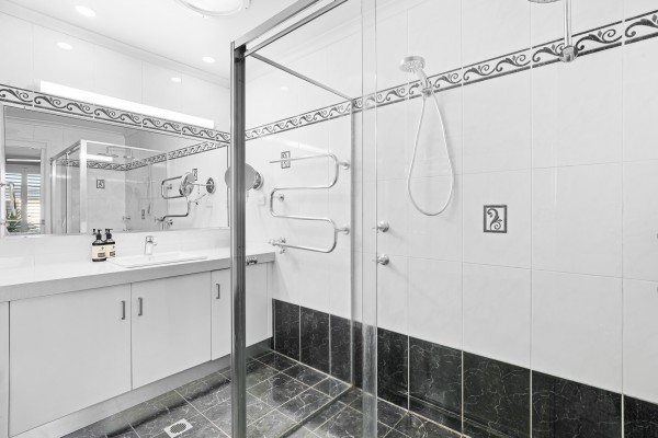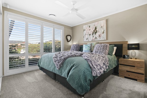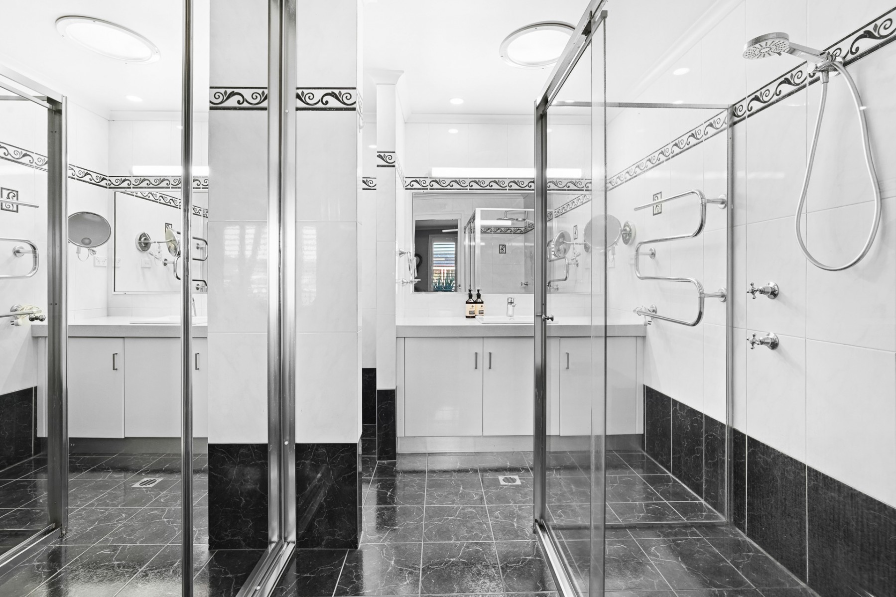 - Main bedroom offering mirrored built-in wardrobe, ceiling fan and extra large ensuite with his and hers shower, second mirrored built-in wardrobe & caesarstone vanity plus tiled from floor to ceiling.