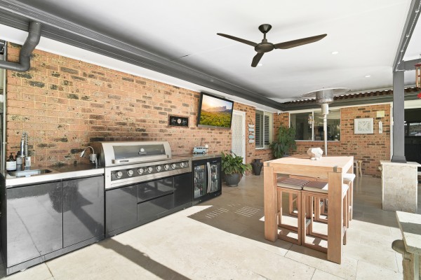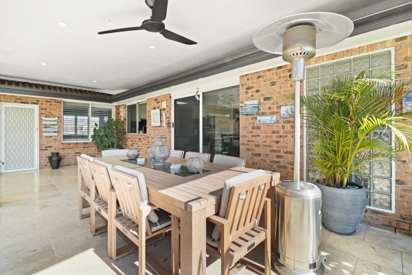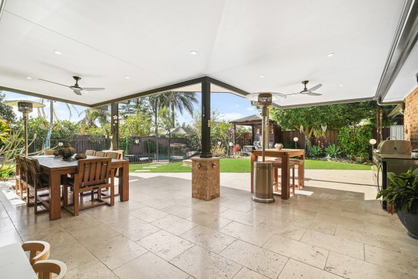 - Oasis style undercover entertainment area with travertine tiles, downlights, ceiling fans and access to automatic double lock up garage