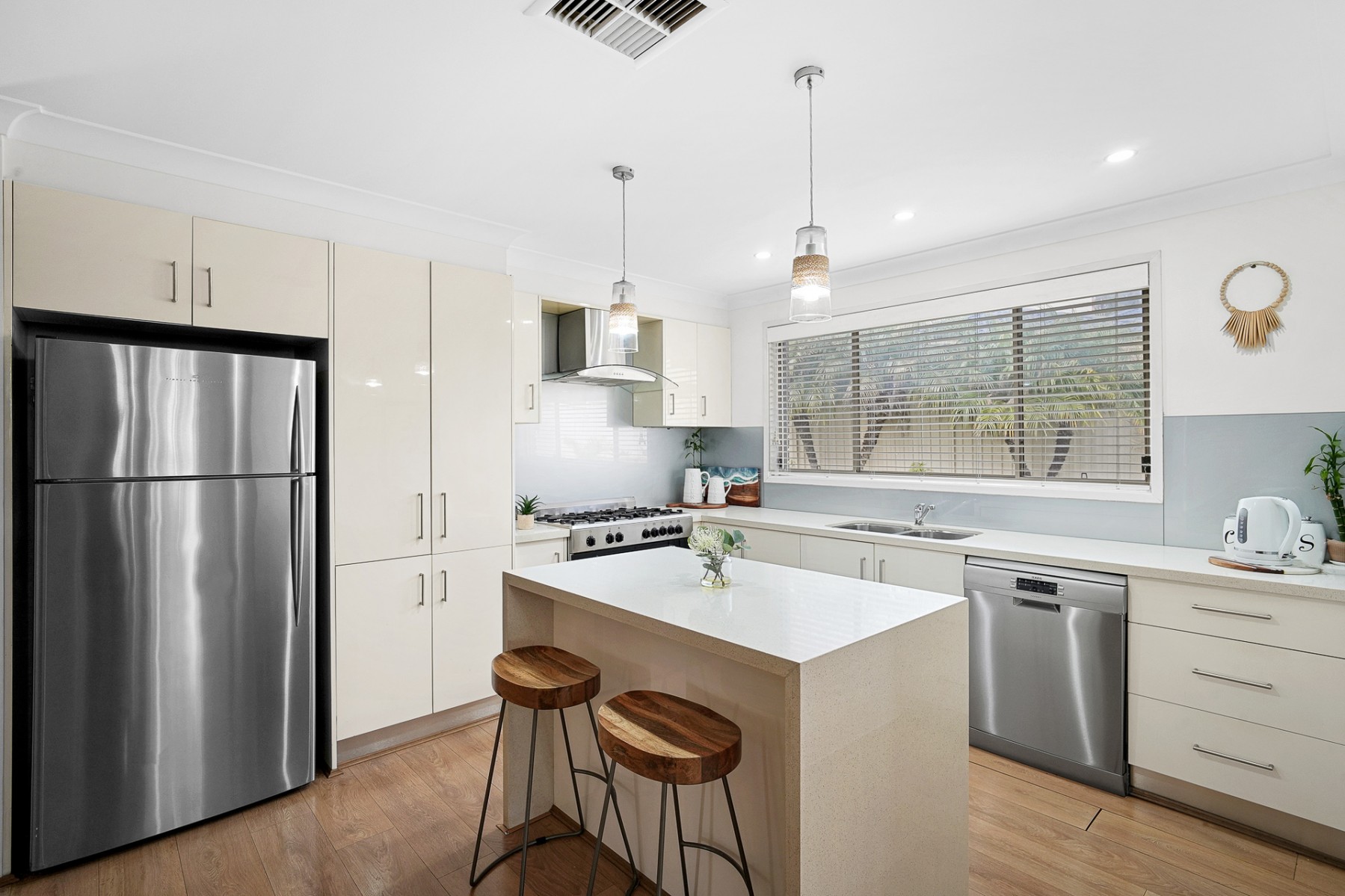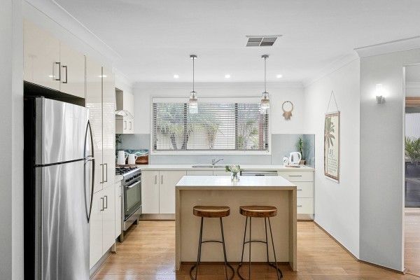 - Stylishly renovated kitchen featuring stainless steel appliances, freestanding stove with gas cooktop, dishwasher, elegant Caesarstone benchtops & a glass splashback – perfect for the modern chef