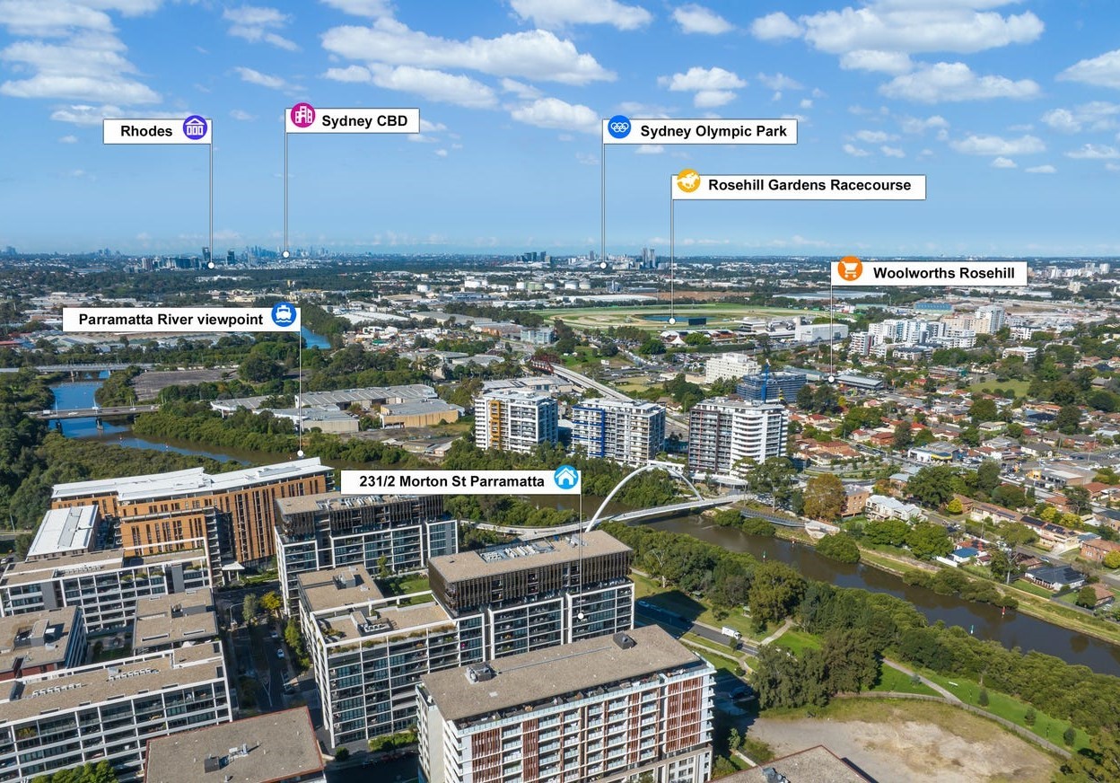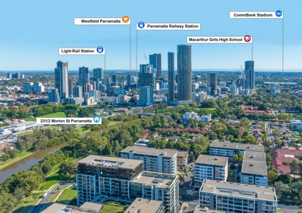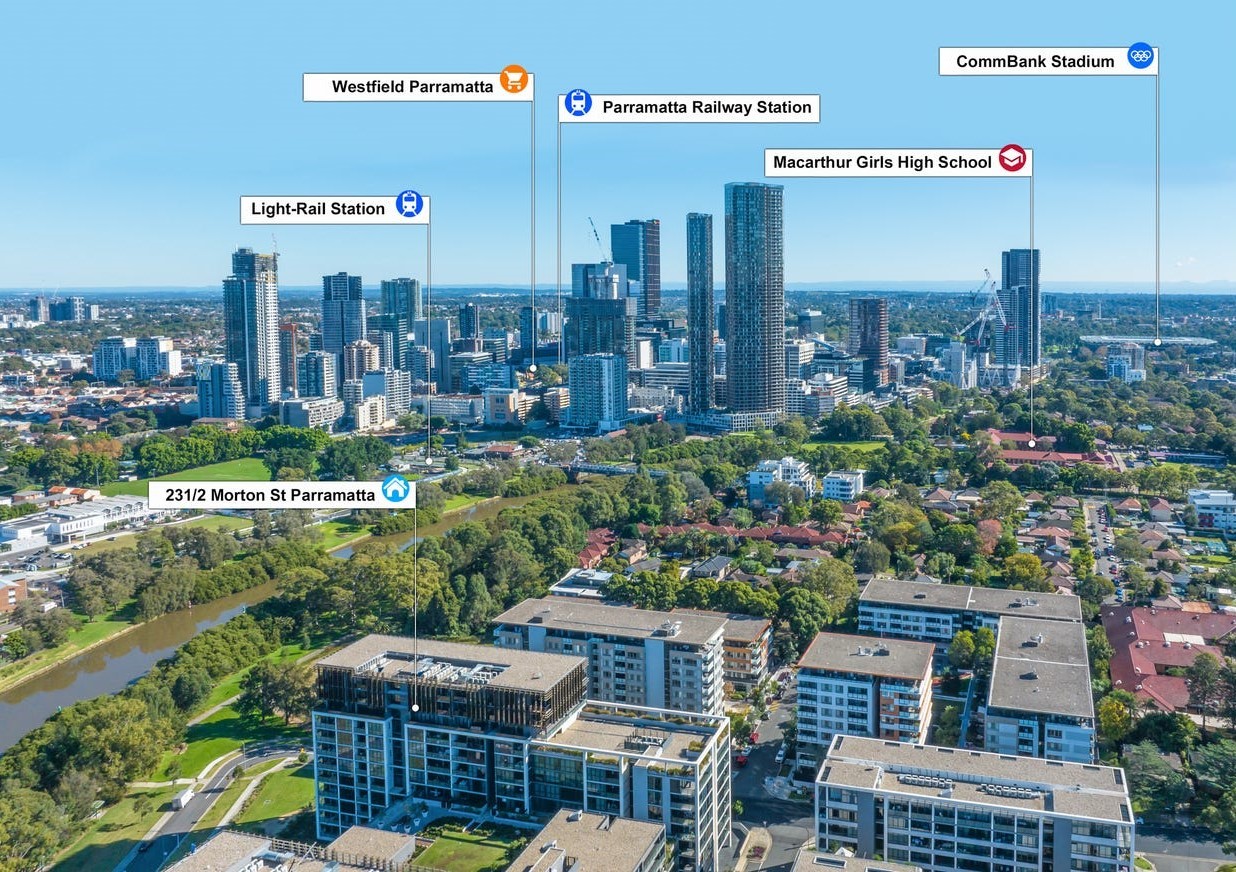 Parramatta Riverwalk and a pedestrian bridge connecting to the light rail station (550m), Parramatta Square (550m), Western Sydney University (900m), local parks.