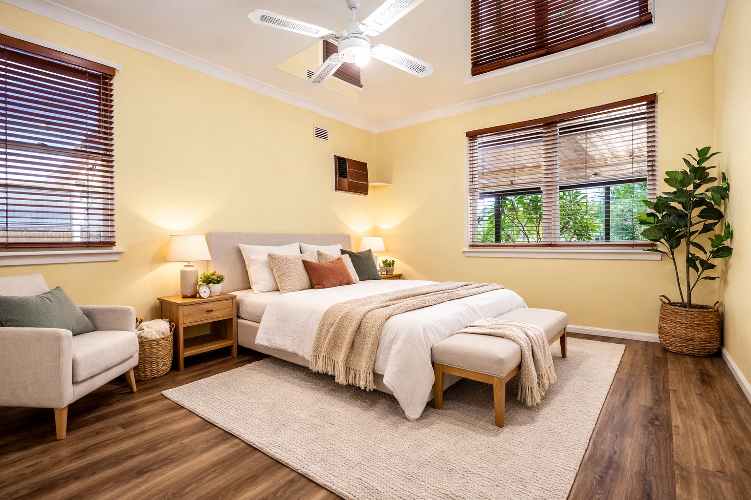 - Three bedrooms, all with built-in wardrobes and ceilings fans