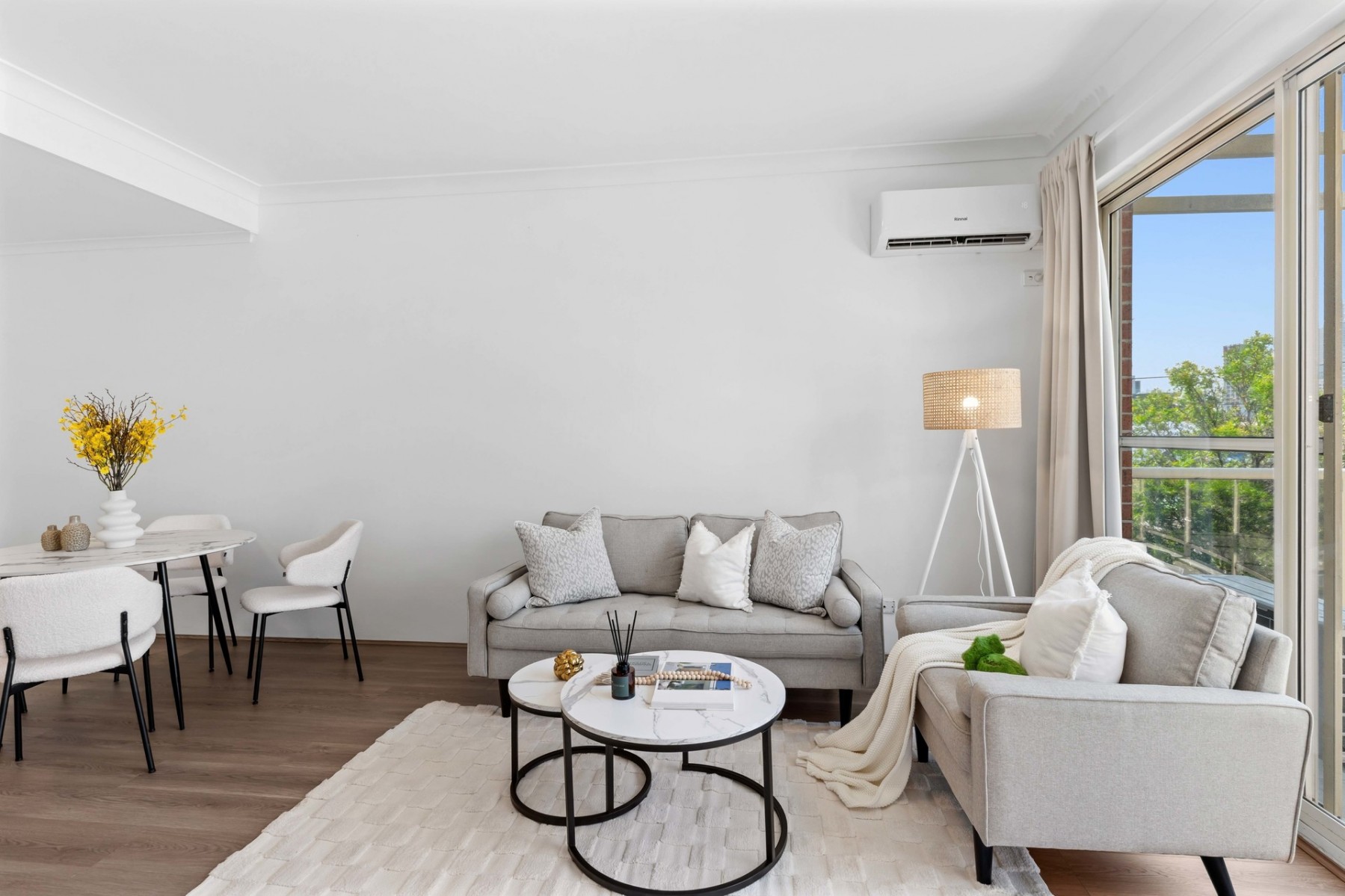 - Bright and spacious open-plan living and dining area with air conditioning