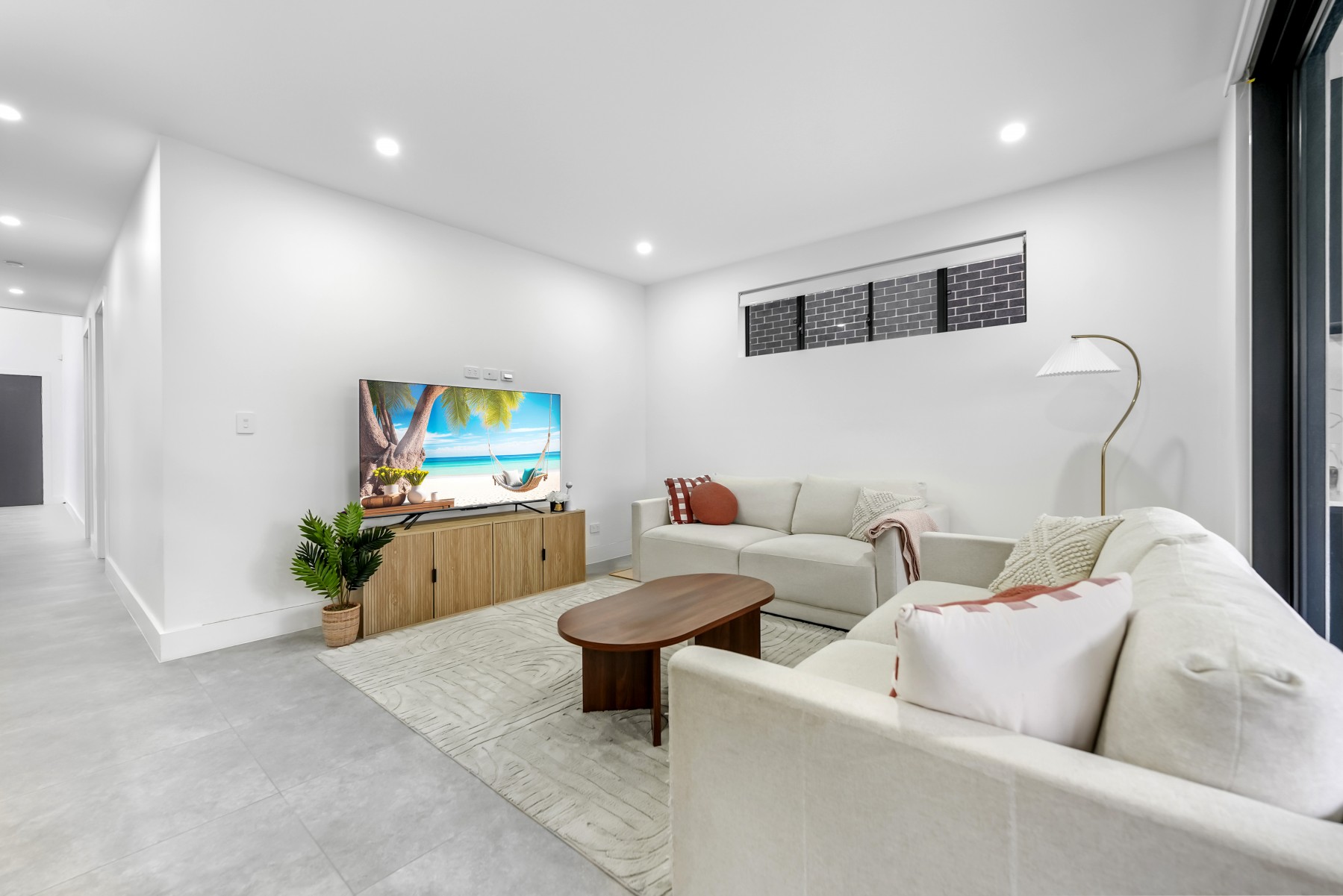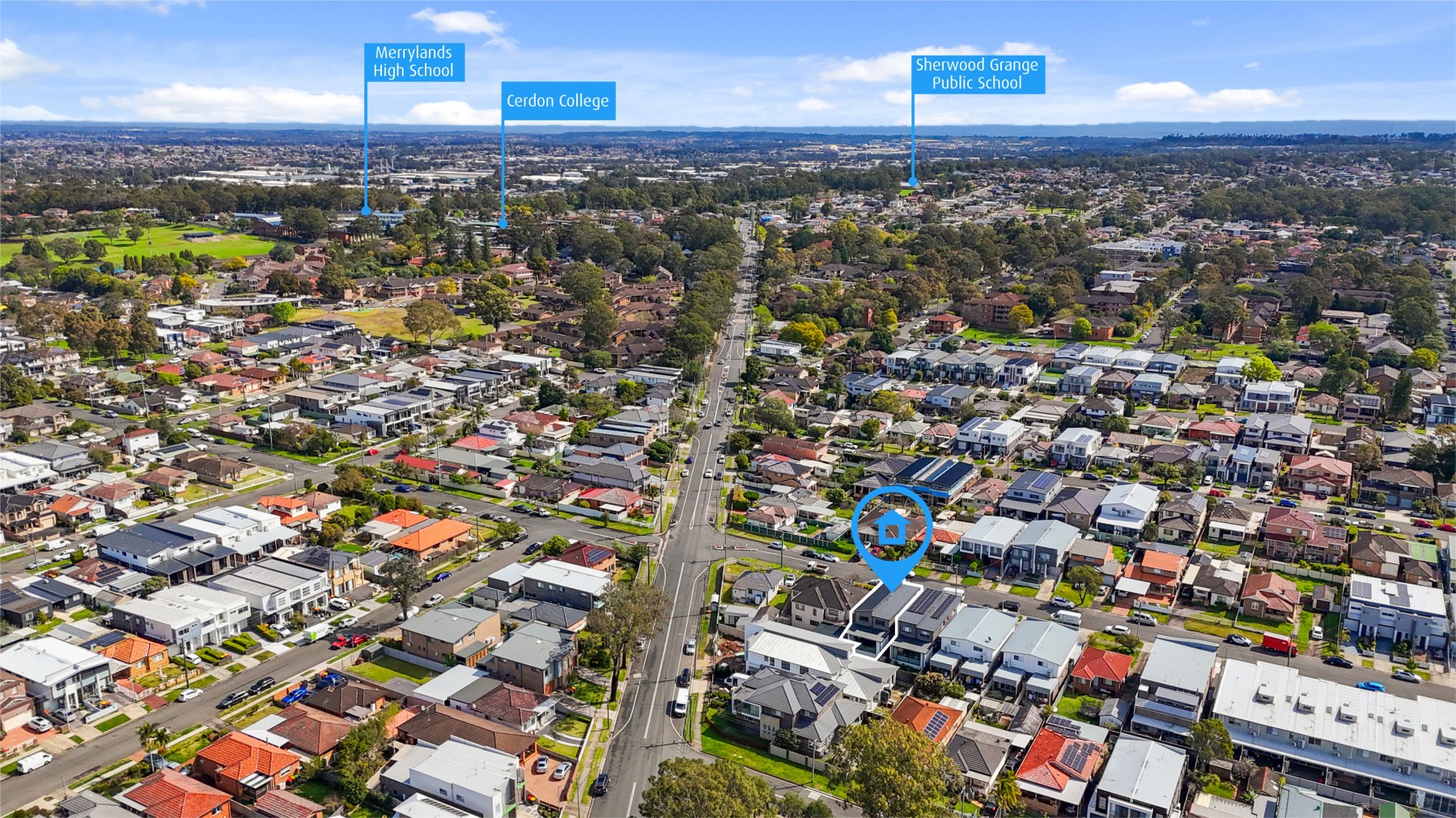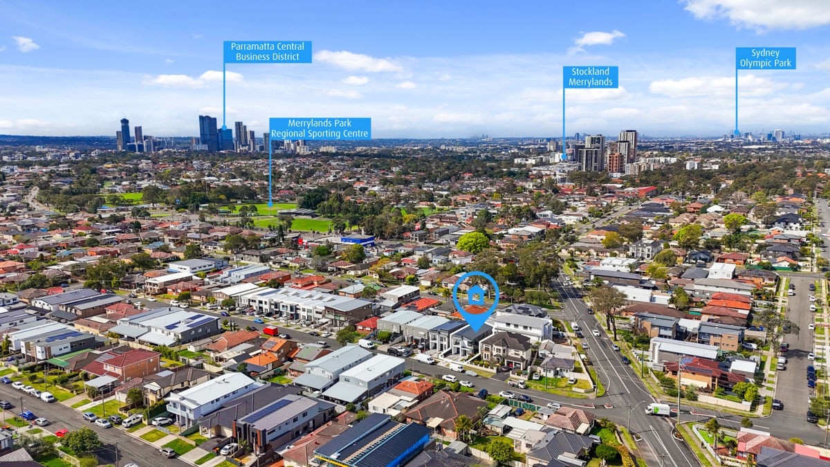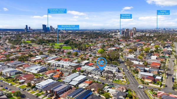 The chic gas kitchen with stone bench tops, island breakfast bar and integrated appliances including dishwasher adjoins a sunny family room which opens to a generous elevated entertaining courtyard with ceiling fans and a second kitchen with stone bench tops, ideal for entertaining or outdoor relaxation while the kids enjoy the private yard. Additional features include an internal laundry with stone bench tops, a spacious walk-in linen press, built-in robes in all bedrooms including a master with ensuite, walk-in robe and private balcony, plus an automated lock-up garage with internal access. Less than 50 metres to the bus stop, 450 metres to Merrylands Sportsground, 650 metres to school, 700 metres to the fast T-Way bus for Parramatta and Liverpool, and 850 metres to Merrylands West Shopping.