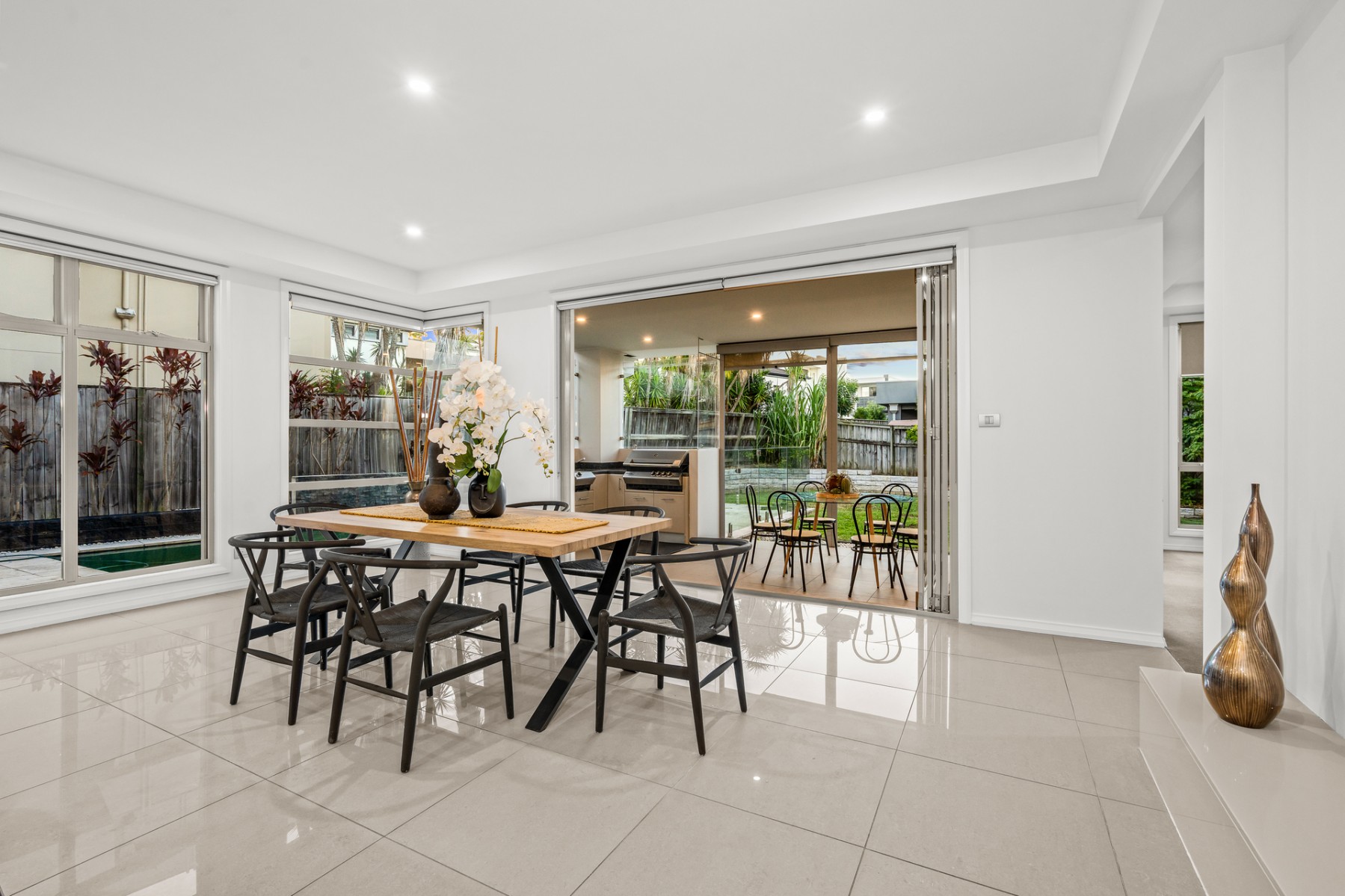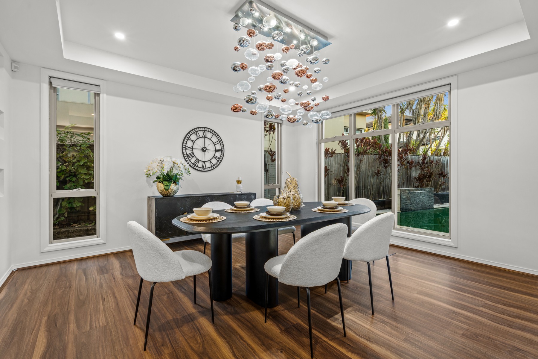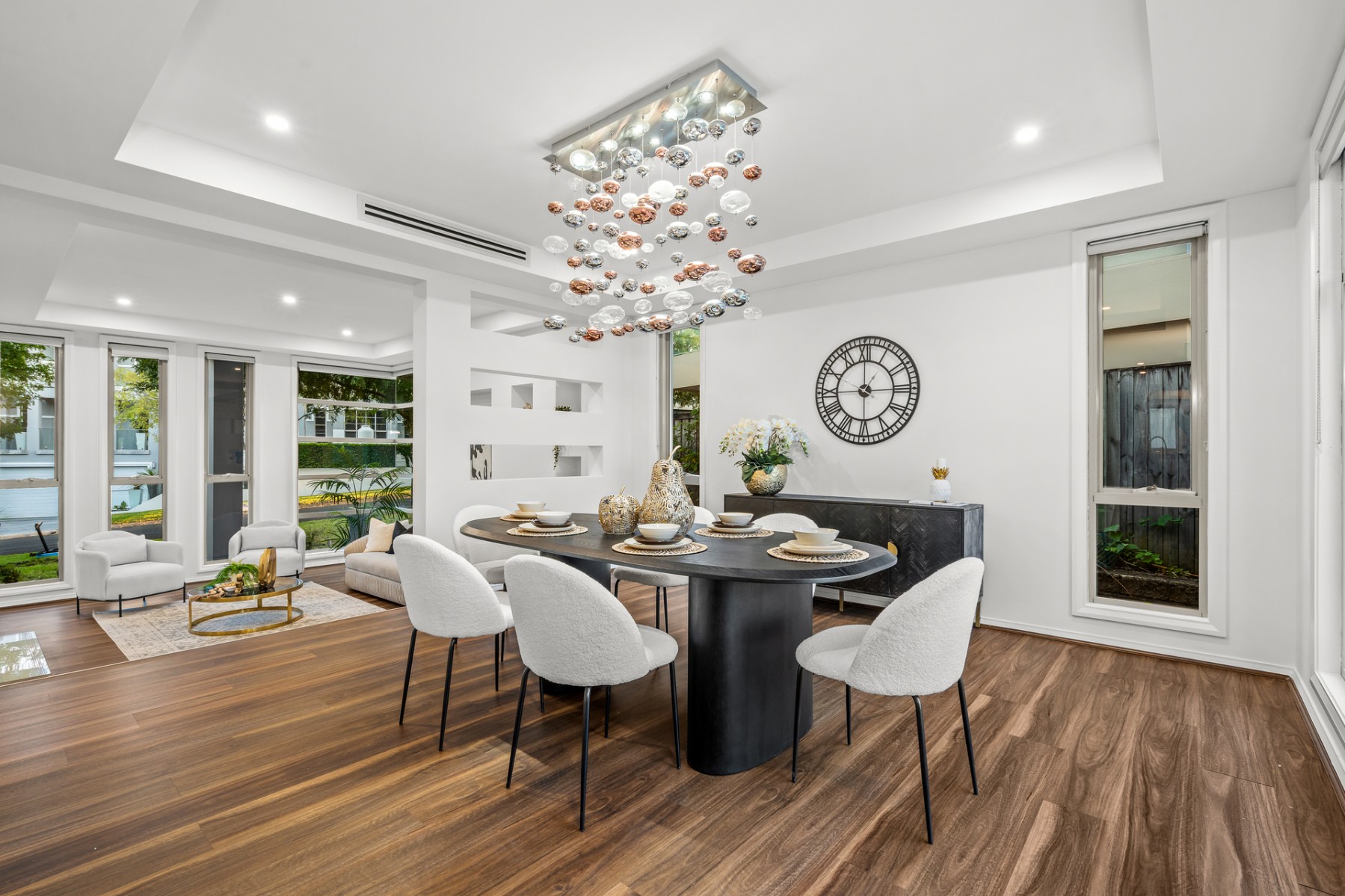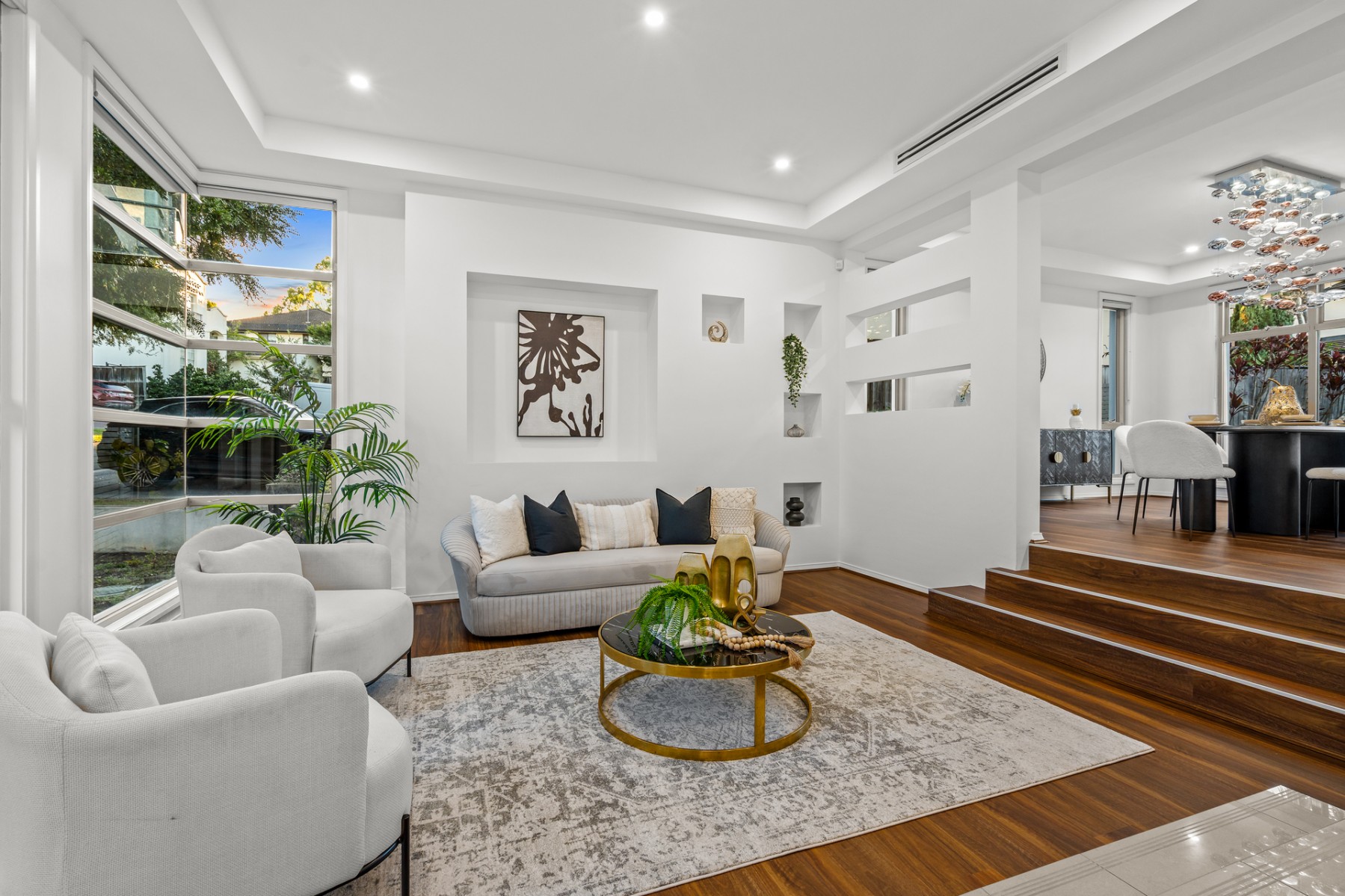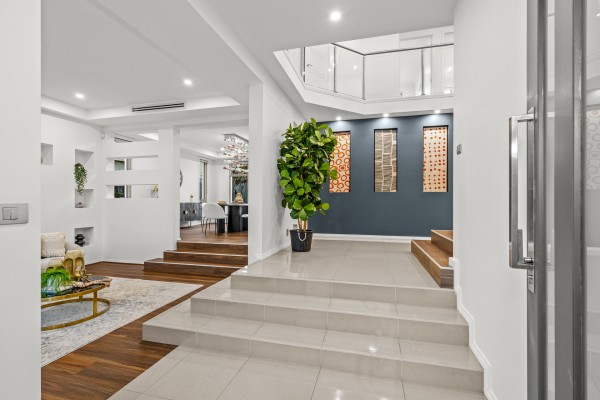 Bathed in natural light, the bespoke interiors unfold across two impeccably designed levels, showcasing expansive yet versatile living zones tailored to accommodate families of all sizes. Every detail has been thoughtfully curated, blending refined elegance with intelligent functionality.