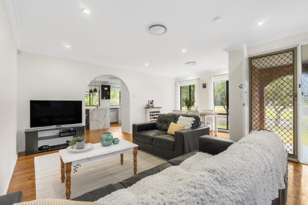 Upon entering this remarkable property, you will be greeted by the warmth of natural floorboards that seamlessly flow throughout the entire home. The living and dining areas have been cleverly combined, creating an open and inviting space that exudes an abundance of natural light, further enhancing the overall sense of airiness and tranquility.