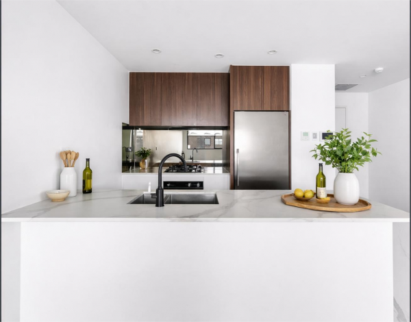 This apartment boasts a spacious open-plan living and dining area that flows seamlessly through glass sliding doors to the extra-large balcony, which creates a perfect blend of indoor and outdoor entertaining areas. The modern kitchen is well-appointed and features high-quality stainless-steel appliances, stone waterfall benchtops, and a glass splashback. The two bedrooms are great in size, with the master retreat featuring a private ensuite and all bedrooms featuring integrated storage.