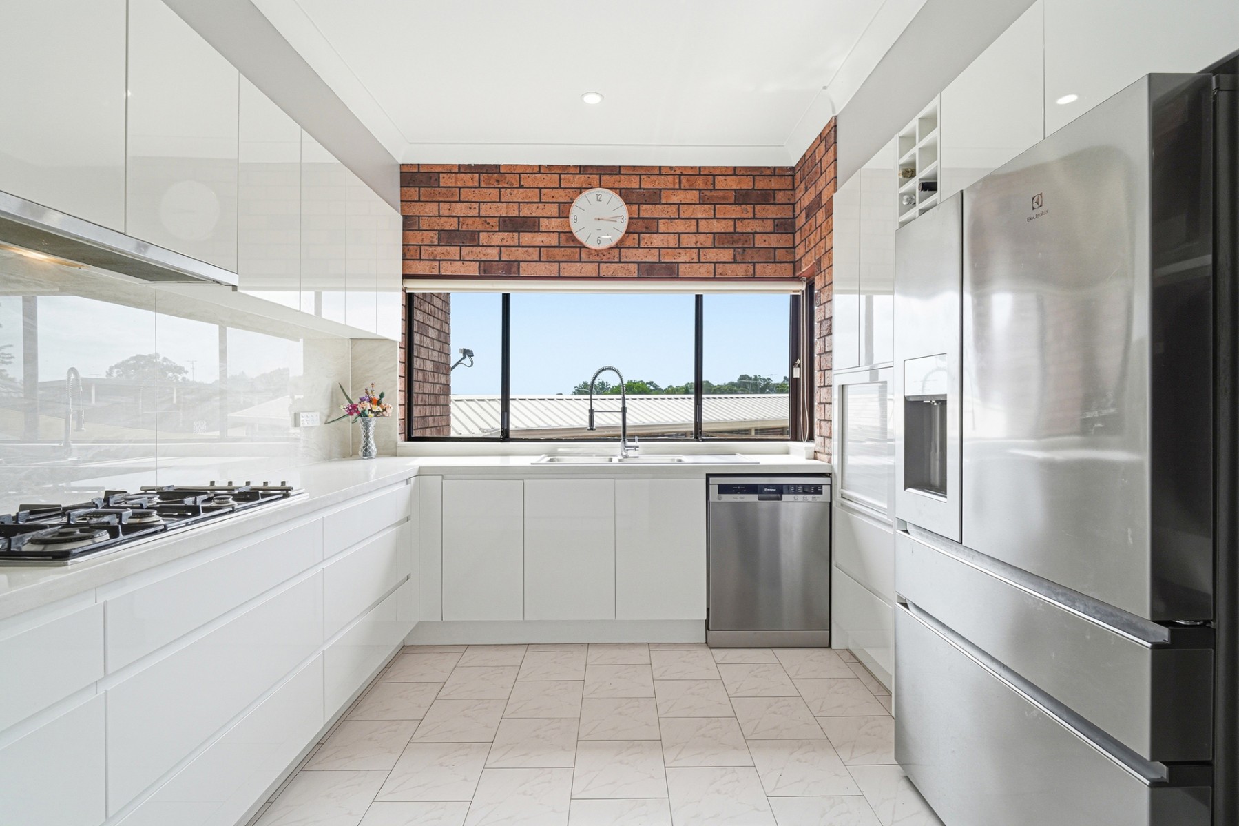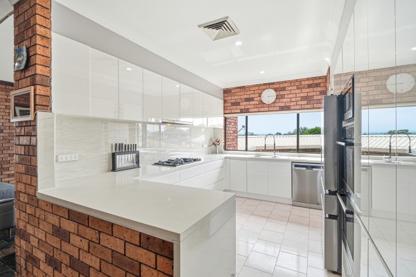 - Stylishly renovated kitchen featuring Caesarstone benchtops, double sink, Electrolux oven, Smeg cooktop and Westinghouse dishwasher, complemented by ample storage and a large window overlooking the pool area and capturing distant mountain views