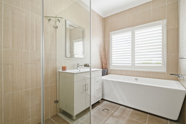 - Fully renovated main bathroom, tiled to the ceiling and featuring a bathtub, separate shower and toilet