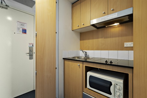 * Sleek kitchenette with stone benches, cooktop and dishwasher