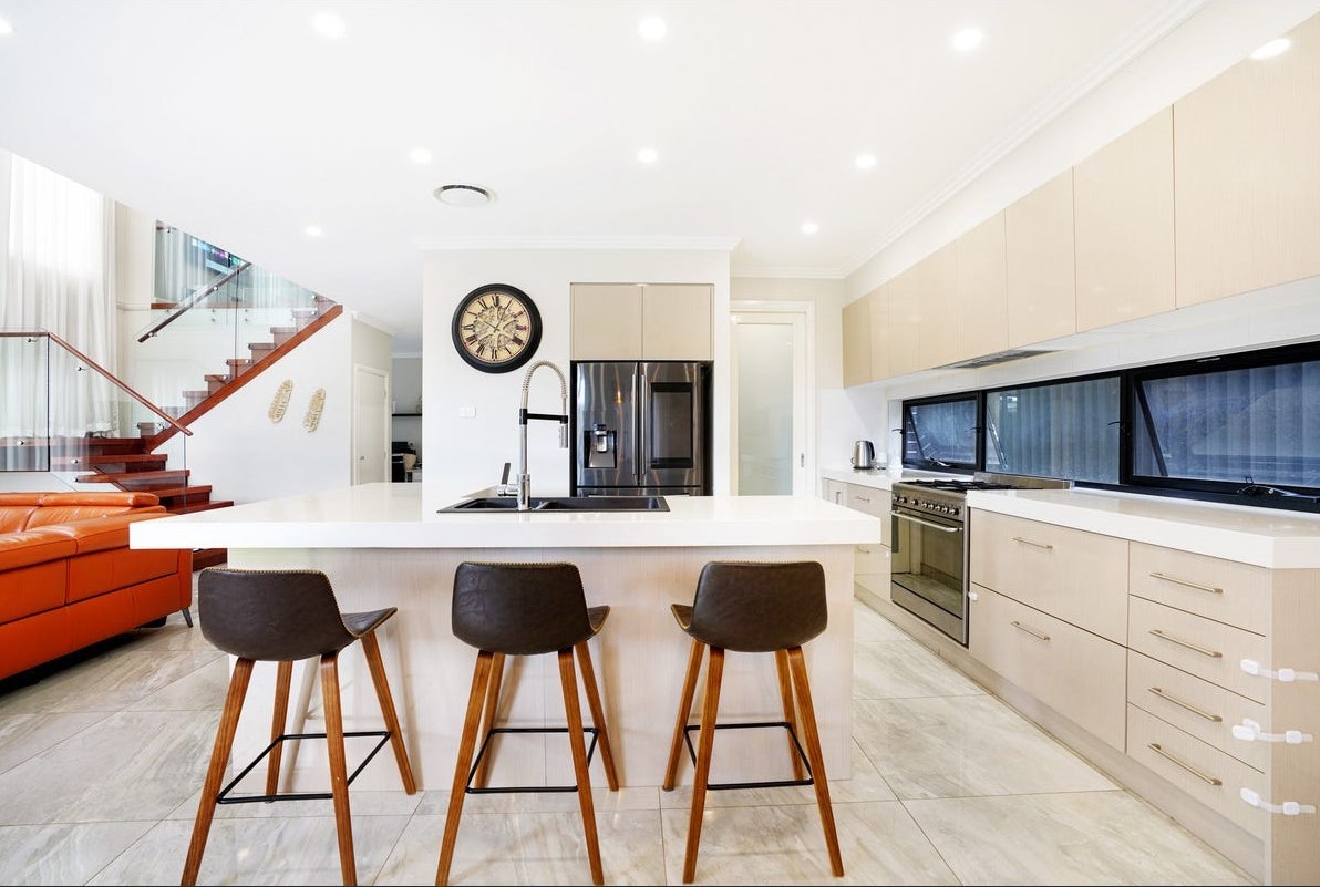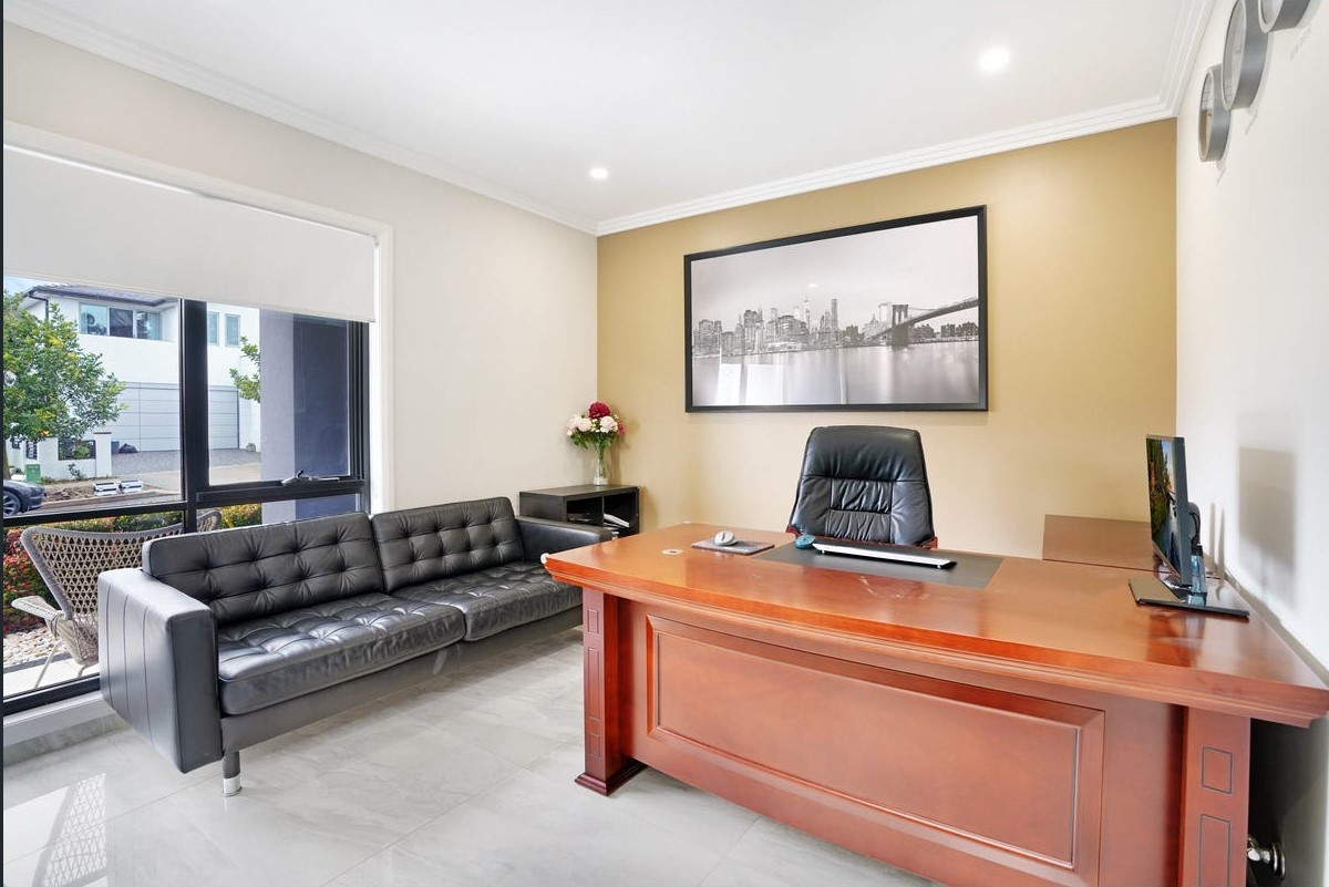 The ground floor features a bright open-plan living and dining area, a stylish gourmet kitchen with premium appliances and butler’s pantry, plus a guest bedroom, home office/study, and full bathroom, ideal for flexible family living.