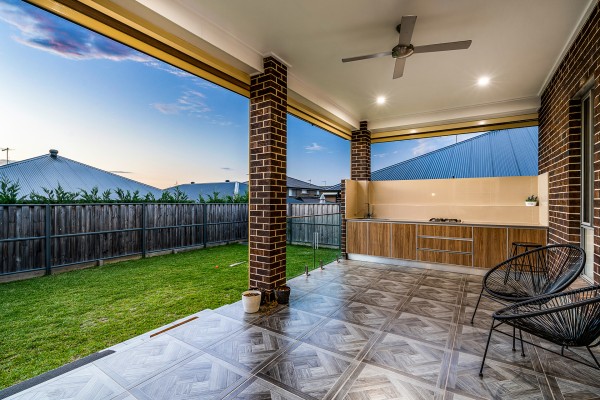 * Undercover alfresco area with built-in outdoor kitchen, ceiling fan and motorised blinds.