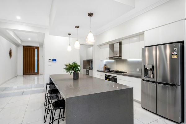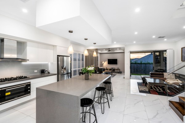 * Open plan kitchen with 60MM grand island benchtop truly designed for entertainment with storage on both sides and Grand size butler's pantry.