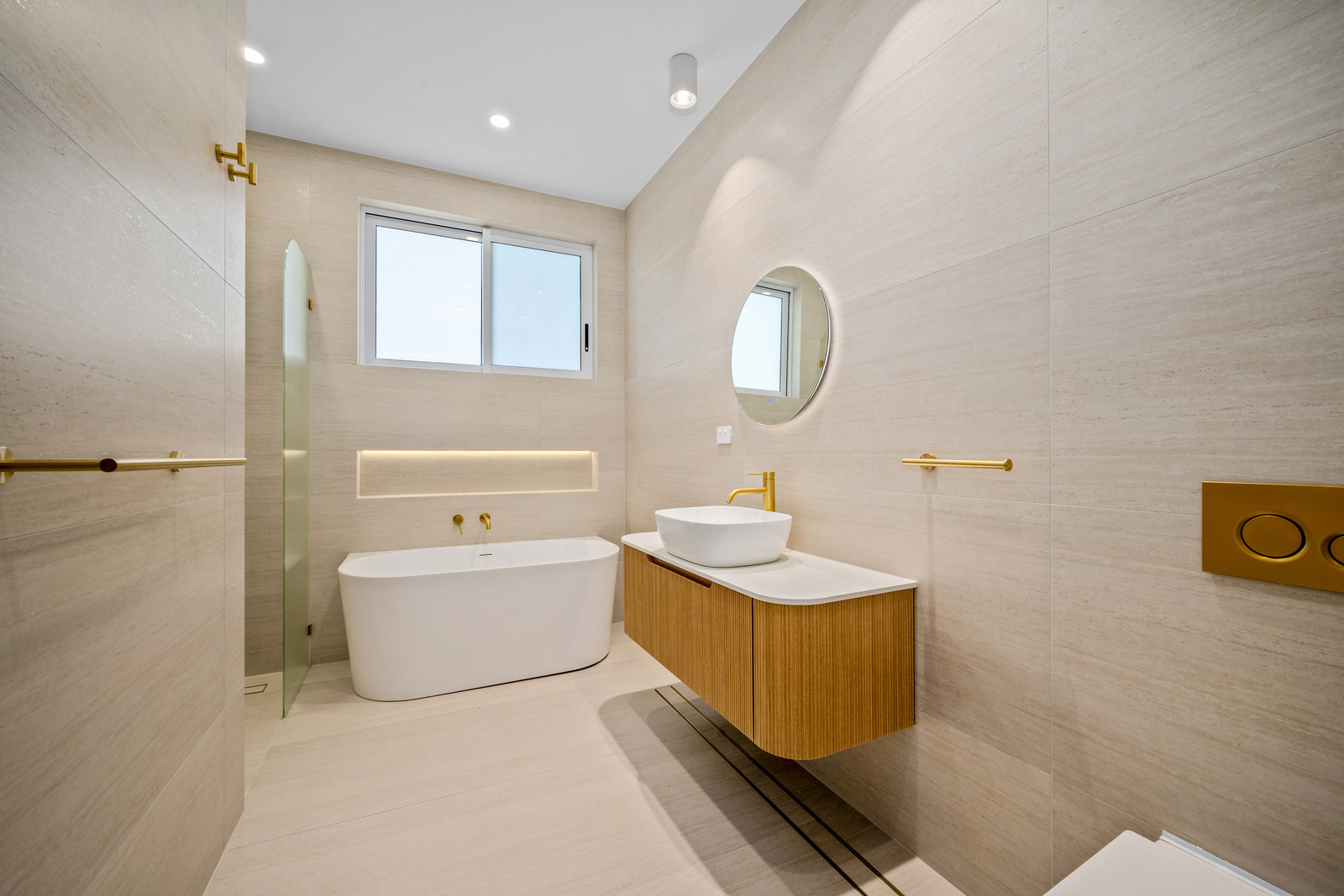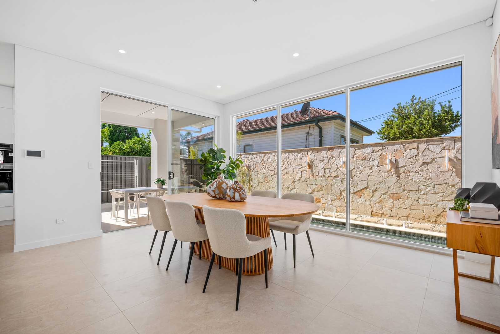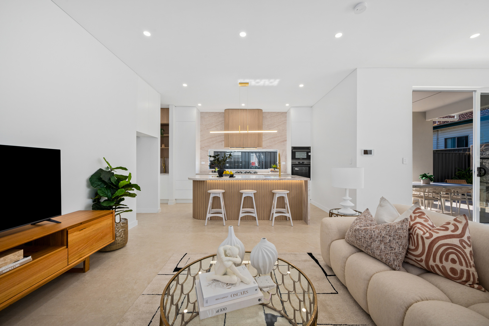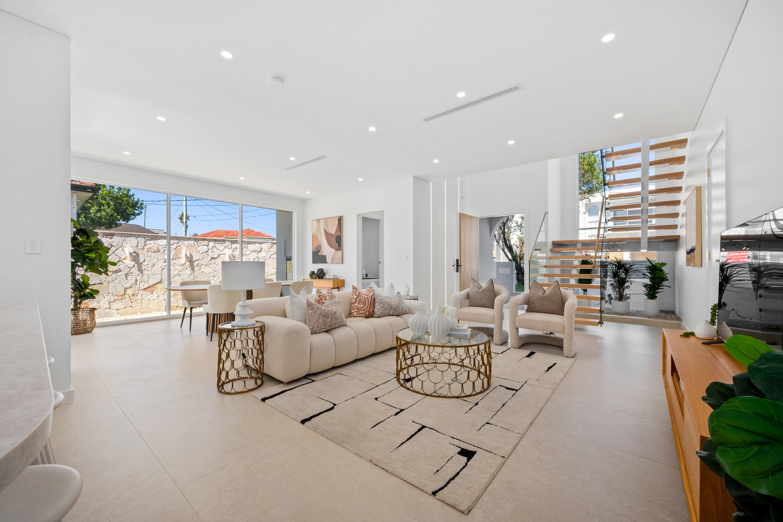 * Expansive open-plan living framed by floor-to-ceiling glass