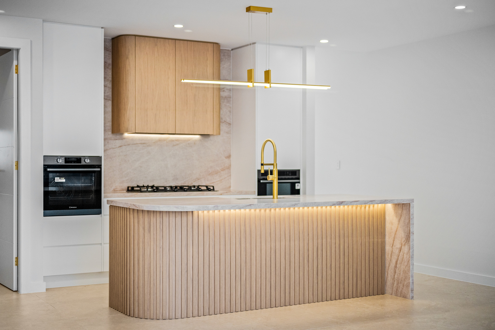* Designer kitchen with a striking Taj Mahal stone island as the centrepiece