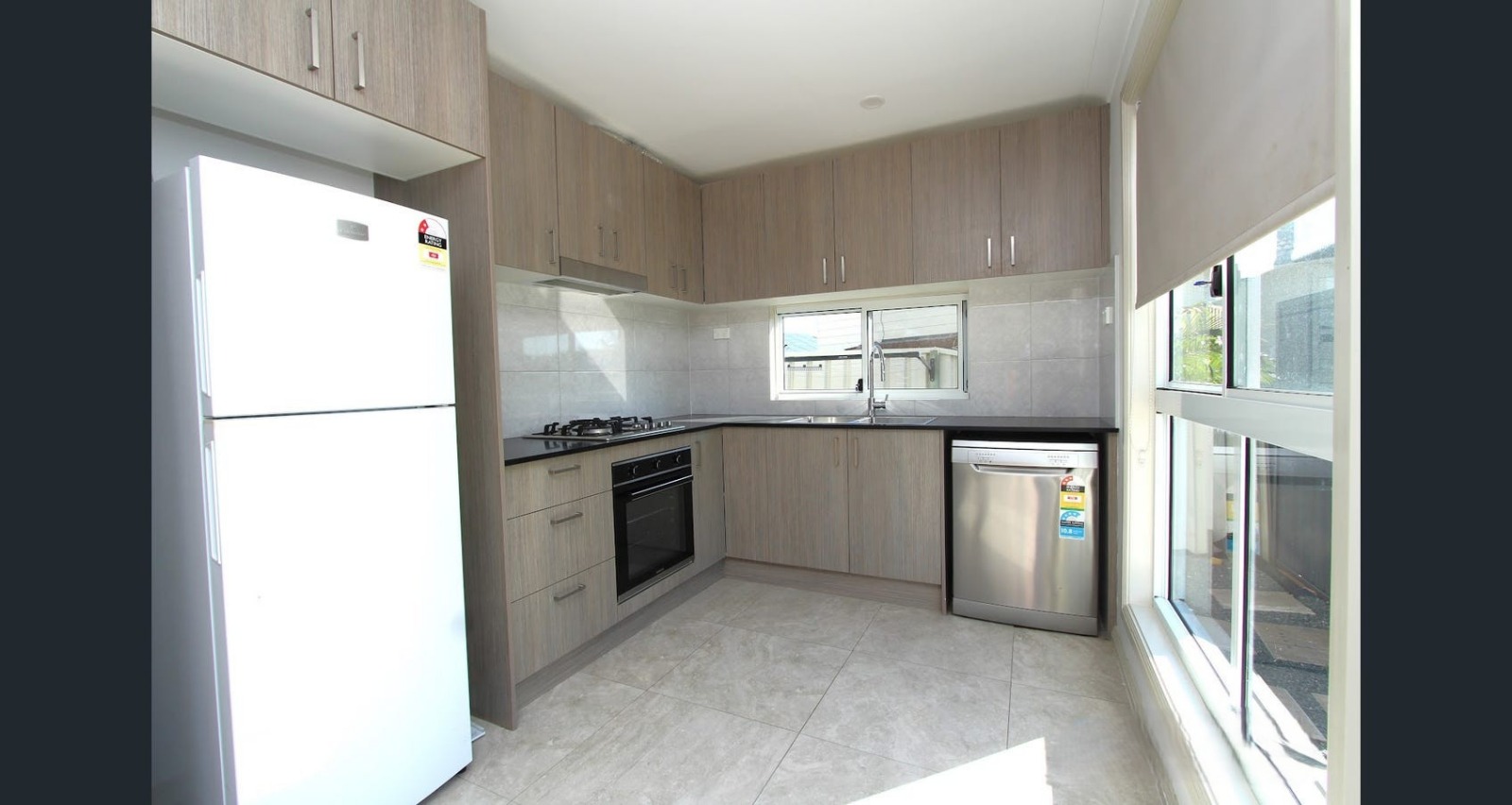 - kitchen with stone bench tops and ample cupboard space and new appliances