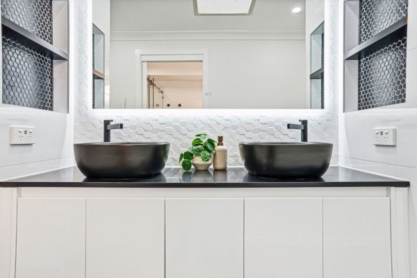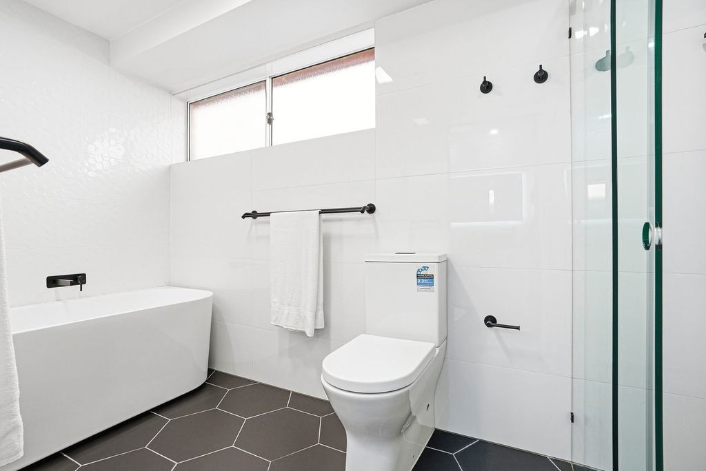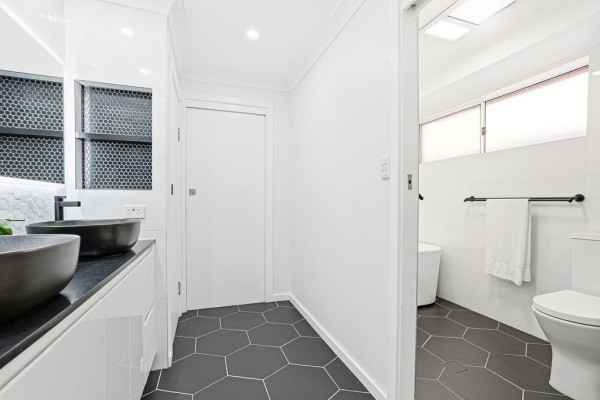 # Modern renovated 3 way main bathroom with access to 2nd & 3rd bedroom showcasing a large shower with matte black twin shower heads, sleek bathtub, separate vanity with stone benchtop, his and hers basins, LED mirror, and toilet