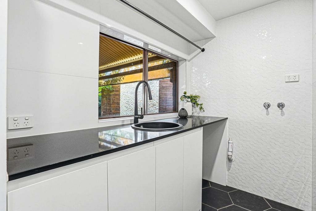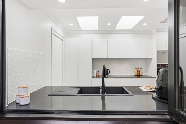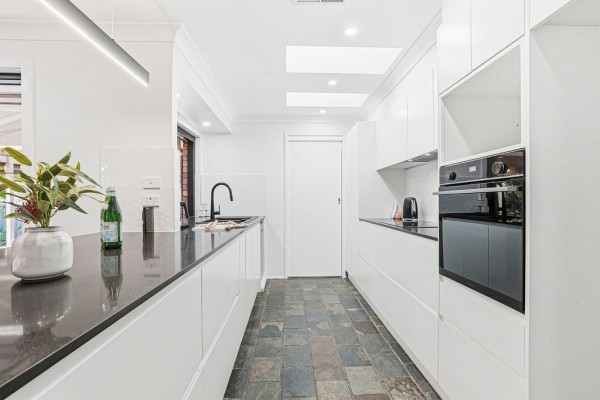 # Stylishly renovated galley kitchen featuring maximum drawer storage, caesarstone benchtops, double sink, asko dishwasher, electric technika cooktop, built-in technika oven, two skylights, ample cupboard space, pantry, and convenient servery access to the outdoor entertaining area-making hosting a breeze.