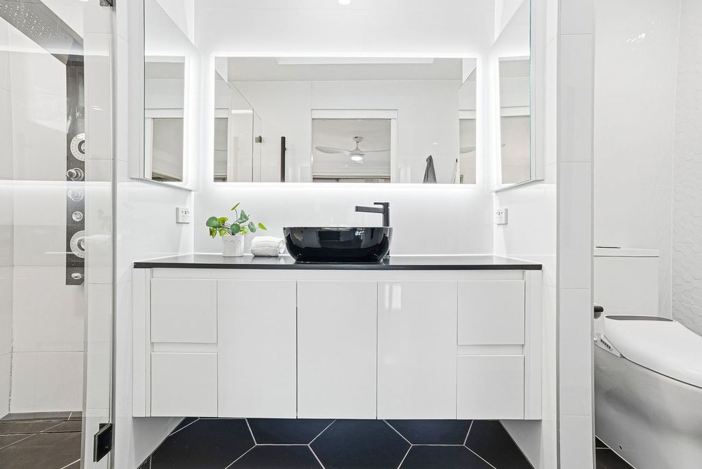 # Spacious master bedroom complete with a mirrored built-in wardrobe and electric window shutter for added privacy, complemented by a beautifully renovated ensuite featuring a matte black shower panel with rainfall head and body jets, mixer controls, a large vanity with stone benchtop, modern back-to-wall toilet with integrated smart/bidet seat, LED mirror, and skylight allowing an abundance of natural light.