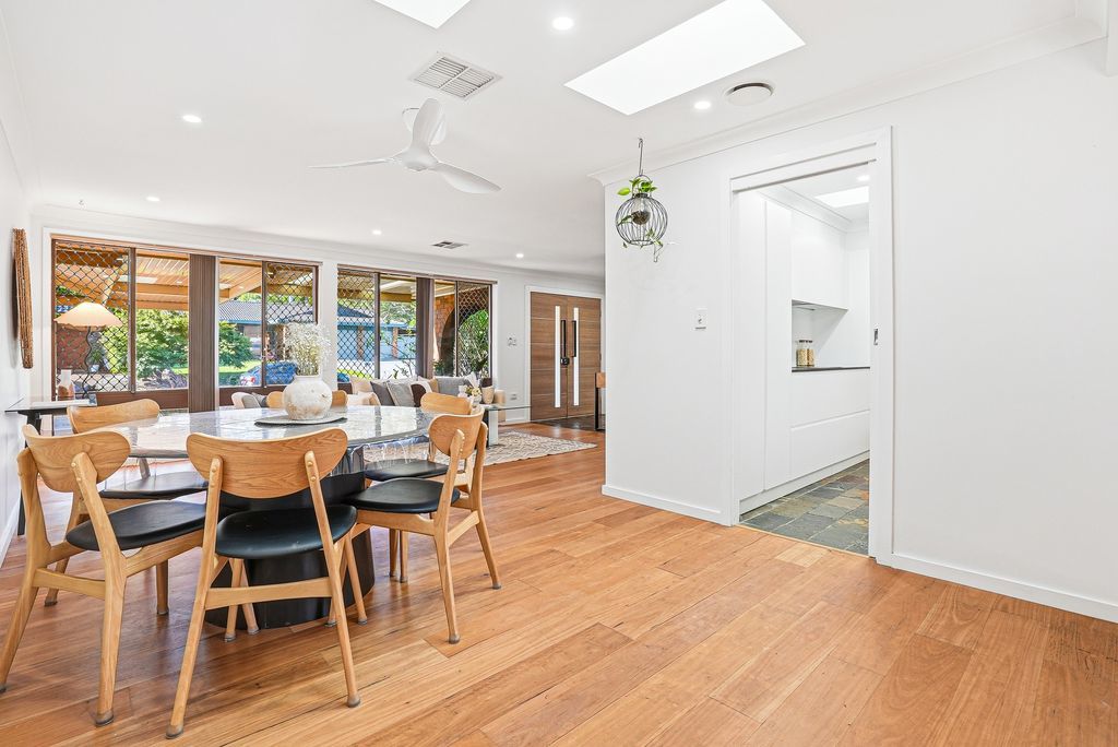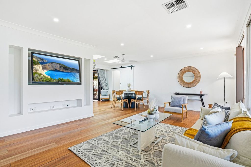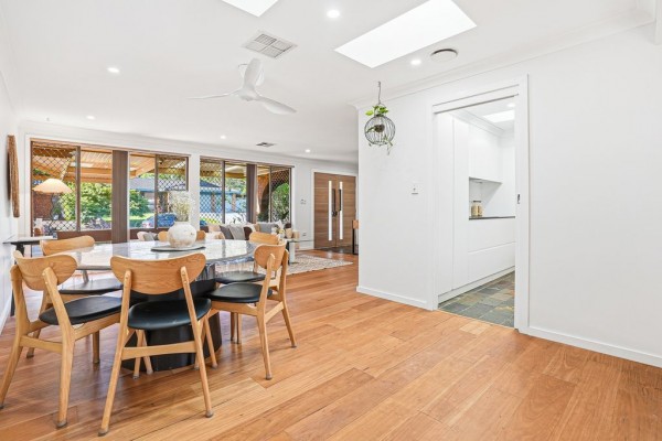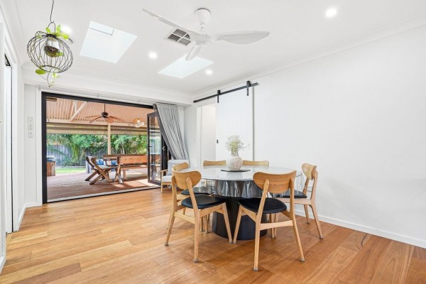 # Generous L-shaped lounge and dining area positioned at the front of the home, enhanced by two skylights, built-in storage, and bifold doors opening seamlessly onto a timber deck-perfect for indoor/outdoor entertaining.