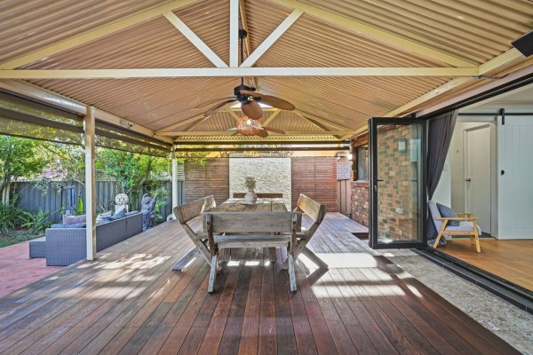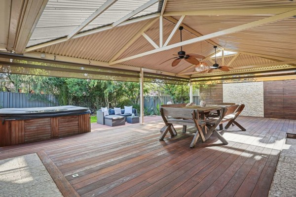 # Expansive outdoor entertaining area with merbau timber decking, two ceiling fans, heaters, and roll-down blinds-creating a comfortable year-round entertaining space