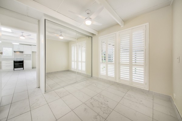 +1 bedroom with new built-in wardrobe, new lighting, new floor tiles, freshly painted, and new fan and a split system air conditioner.