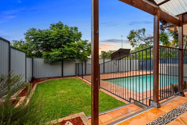 At the heart of the home, a bi-fold servery window opens effortlessly from the kitchen to the pergola, creating the perfect setting for family gatherings and entertaining. The backyard overlooks lush lawns and a sparkling private swimming pool, offering a relaxed, resort-style atmosphere ideal for year-round enjoyment.