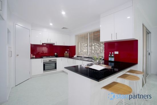 * Chic polyurethane kitchen with stone bench tops and gas cooktops