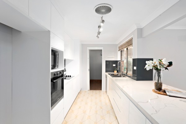 THE KITCHEN: Renovated galley style kitchen offering a pyrolytic oven, electric cooktop, a dishwasher and a large built-in pantry featuring slide out drawers, plus a spacious breakfast bar