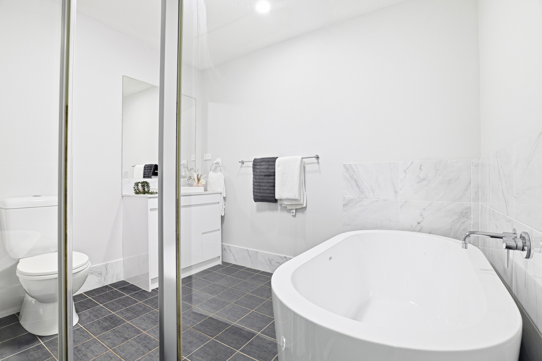 - Modern main bathroom featuring a freestanding bath, shower and toilet, designed for relaxation and style
