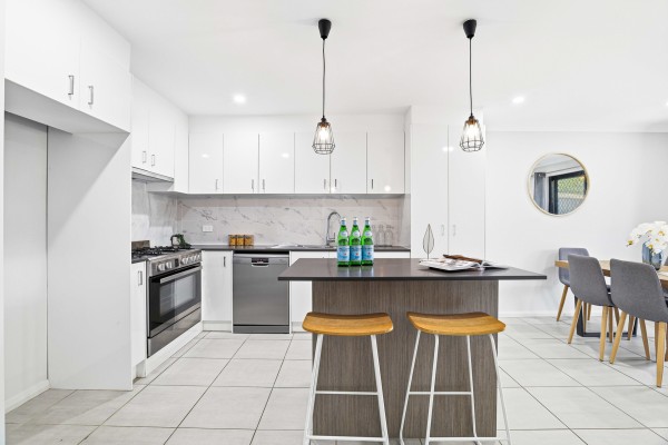 - Stunning renovated kitchen showcasing Caesarstone benchtops and island bench, double sink, Dynamicmega dishwasher and oven plus gas cooktop - a true heart of the home