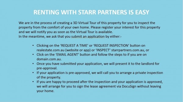 If you are interested in the property, submit your application. If you are on realestate.com.au (website or app) or starrpartners.com.au, click on ‘REQUEST A TIME, ‘REQUEST INSPECTION’ or ‘INSPECT’ button to receive a link. If you are on Domain.com.au click on the ‘EMAIL AGENT’ button and follow the steps to receive an application.