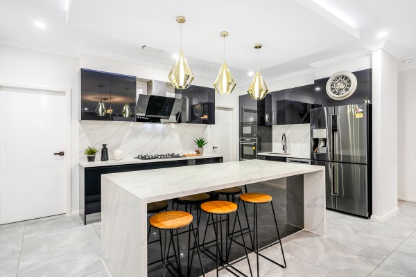 ~ Modern Kitchen with natural stone benchtops, quality appliances, Microwave Tower & Walk in Pantry.
