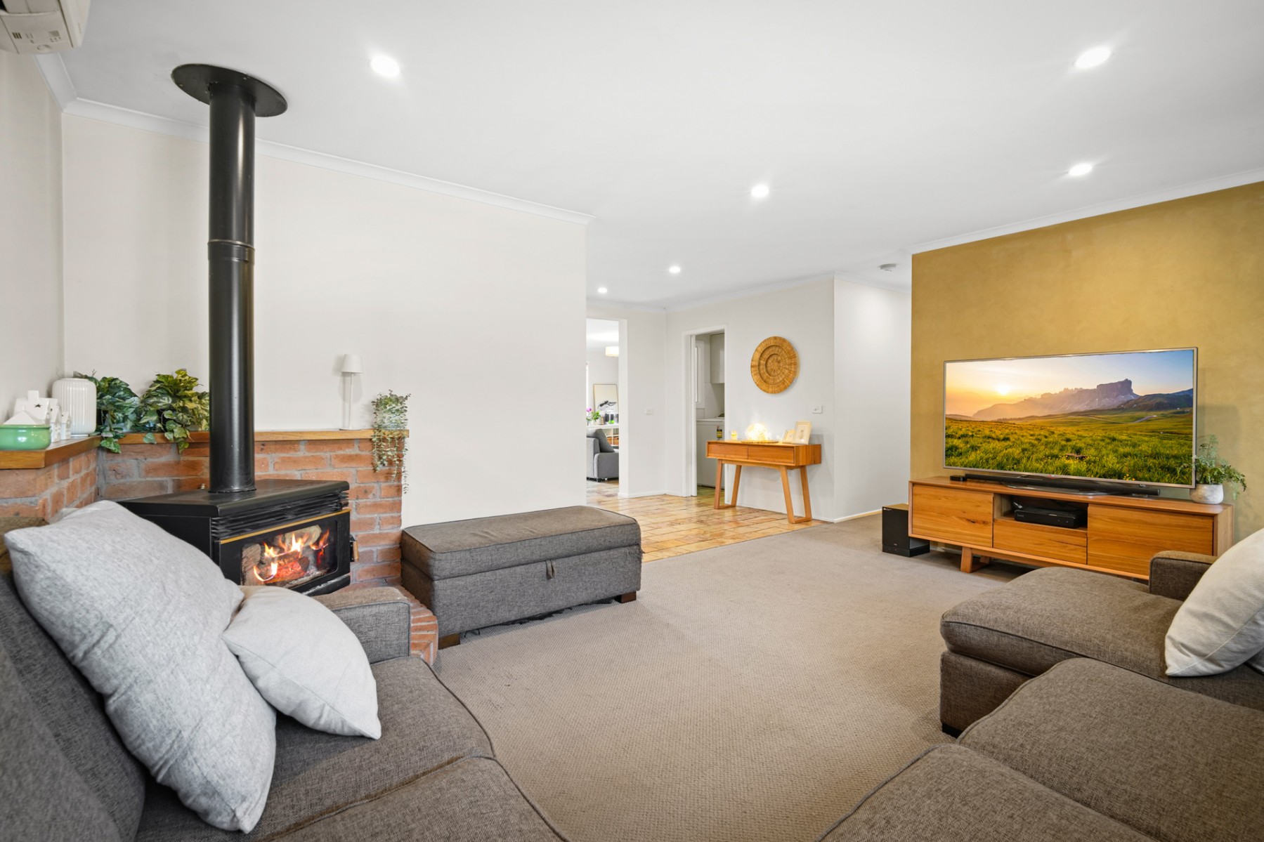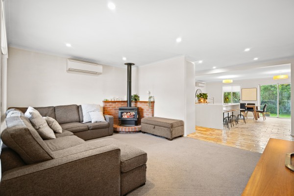 - Lounge room to front of the property with Daiken split system air-conditioner, wood fireplace and LED downlights throughout