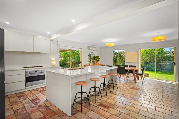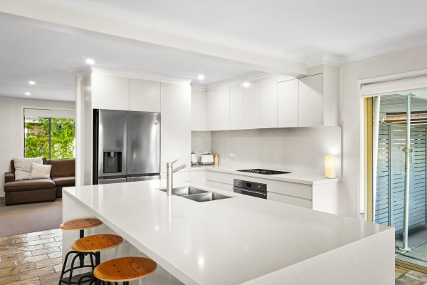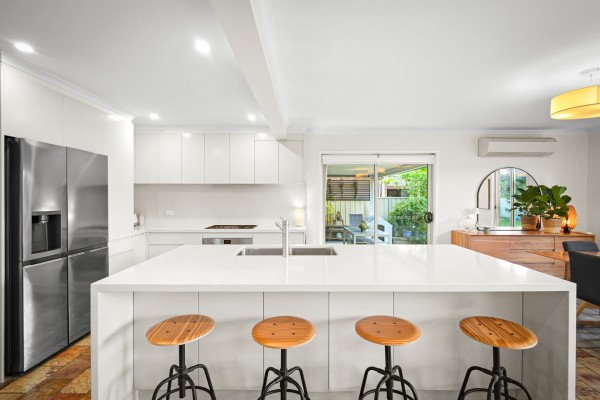 - Beautifully renovated open plan kitchen with large caesarstone island bench with breakfast bar, double sinks, Asko dishwasher, 5 burner gas cooking top and electric oven plus soft closing draws