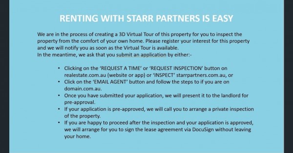 If you are interested in the property, submit your application. If you are on realestate.com.au (website or app) or starrpartners.com.au, click on ‘REQUEST A TIME, ‘REQUEST INSPECTION’ or ‘INSPECT’ button to receive a link. If you are on Domain.com.au click on the ‘EMAIL AGENT’ button and follow the steps to receive an application.