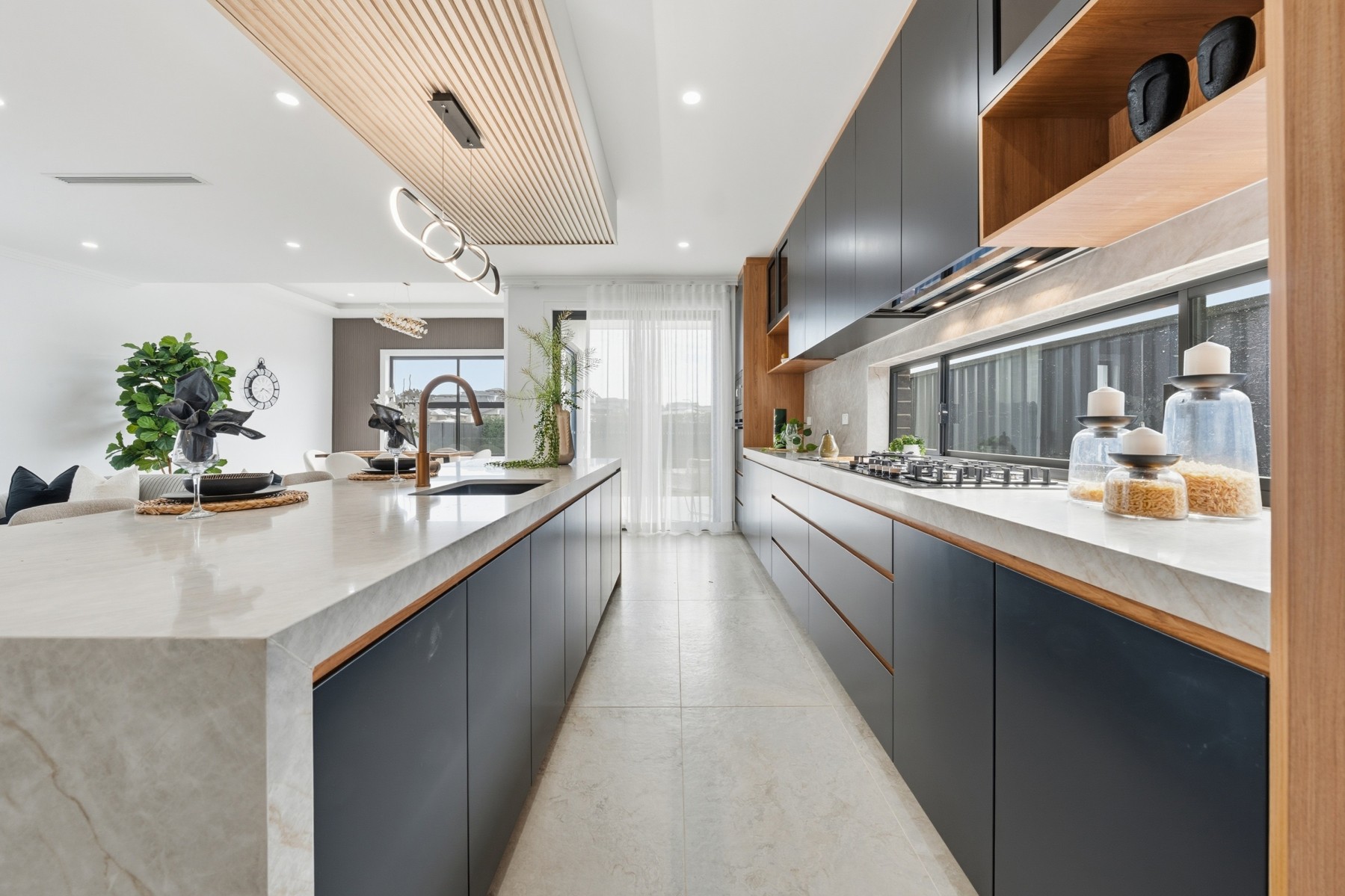 Designer kitchen featuring stone benchtops, premium appliances, gas cooking, and ample storage